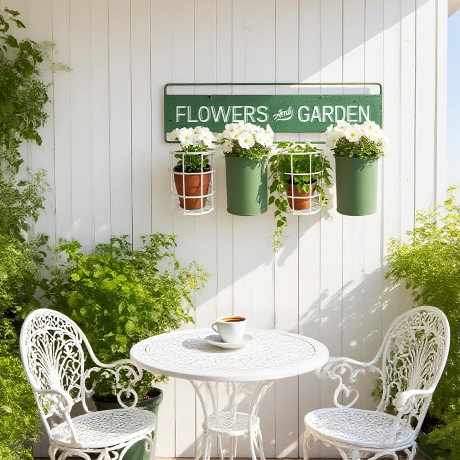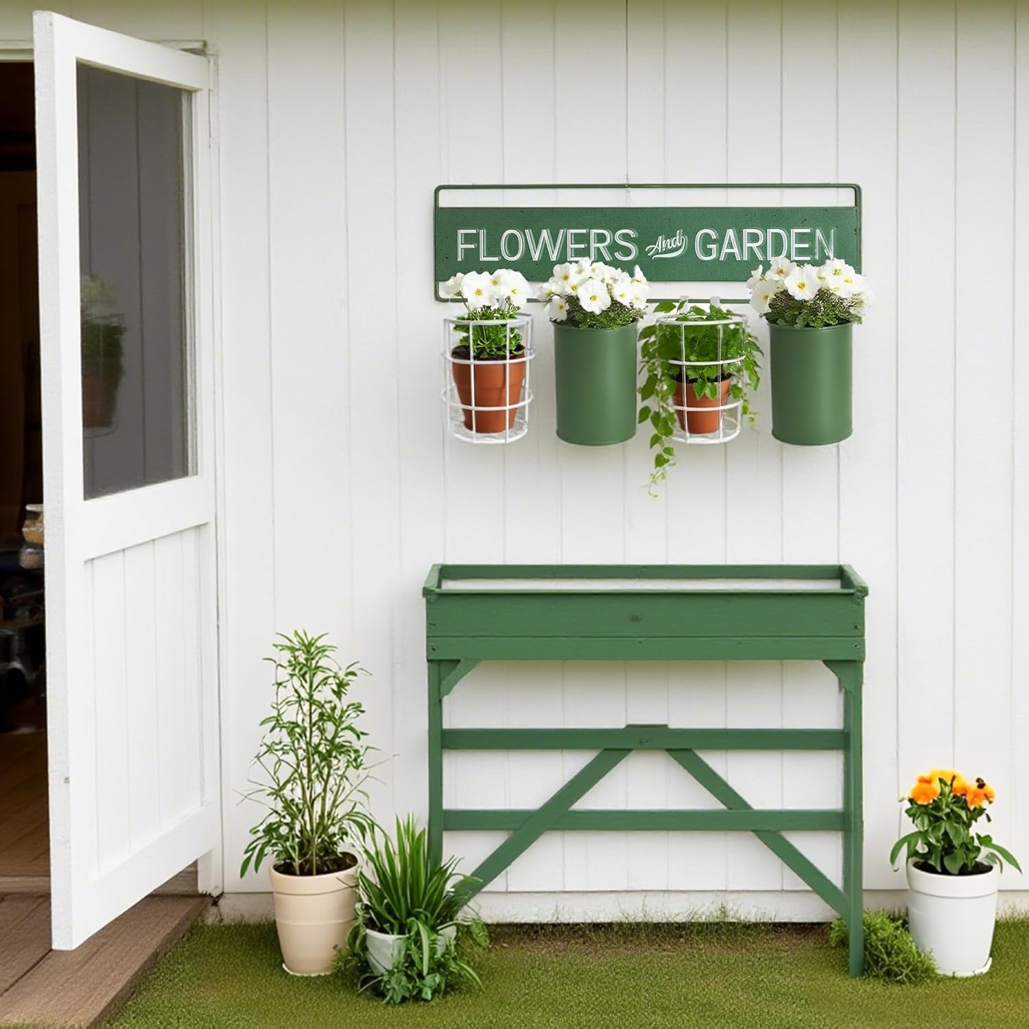 - 【CHARMING VINTAGE DESIGN】Features a green metal sign with "Flowers & Garden" lettering and four hanging pots (two caged, two solid), blending classic garden aesthetics with rustic charm to enhance any space.