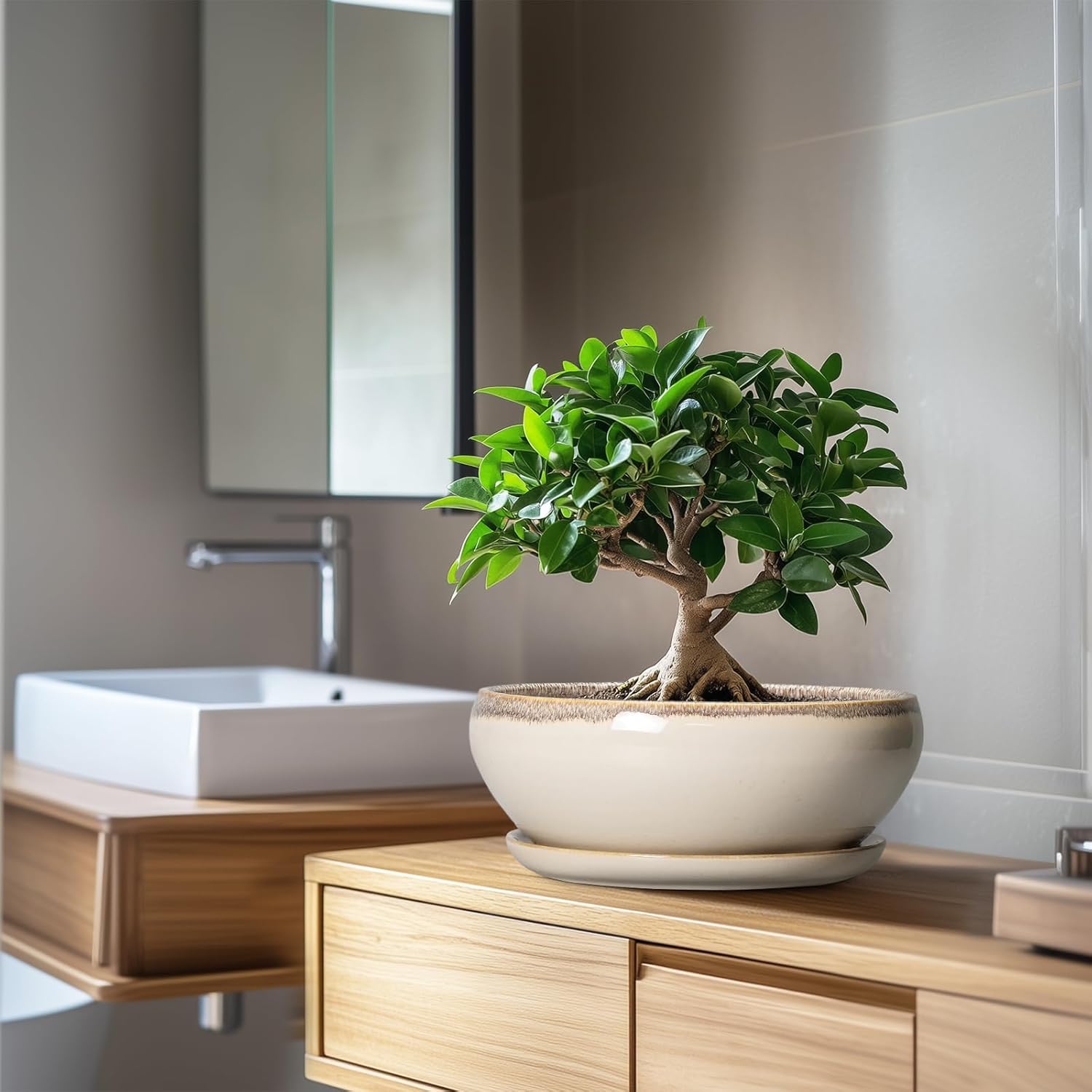 SQOWL Bonsai Tree Pots - 10 Inch Ceramic Succulent Pots, Round Shallow Planter with Drainage Hole and Tray, Bowl Planter for Indoor Outdoor Plants Flowers, Room Decor, Garden Gifts, Beige