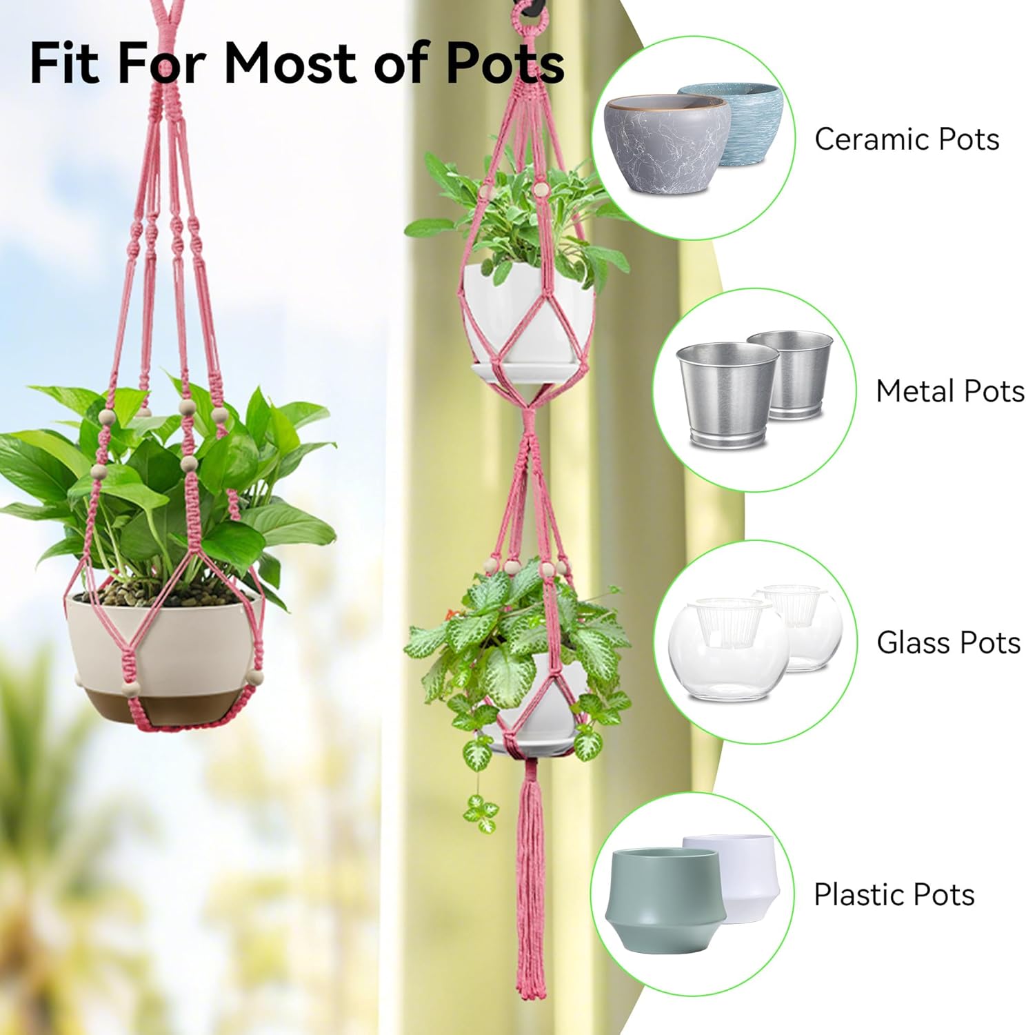 USLAI Macrame Plant Hanger Indoor Outdoor, Up to 4-15 inch Pot, Heavy 20lb Planters, Extra Long Strong Hanging Planter Basket Holder, Boho Home Decor, 35+49 Inch, Pink (POTS NOT Included)