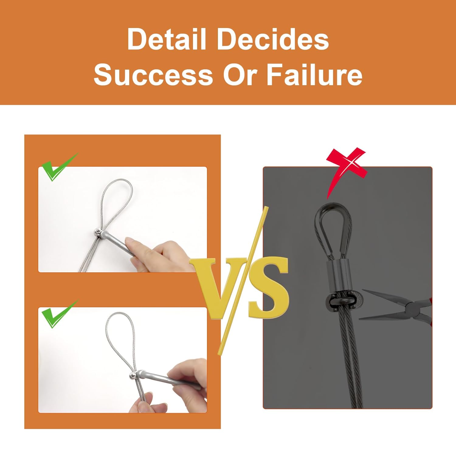 - Easy to Install: The stainless steel cable kit is compact and easy to assemble and disassemble. First, cut the cable length as required. Then use the matching thimble and aluminum sleeve to fix the end, and fine-tune the tightness through the adjustable kink tensioner