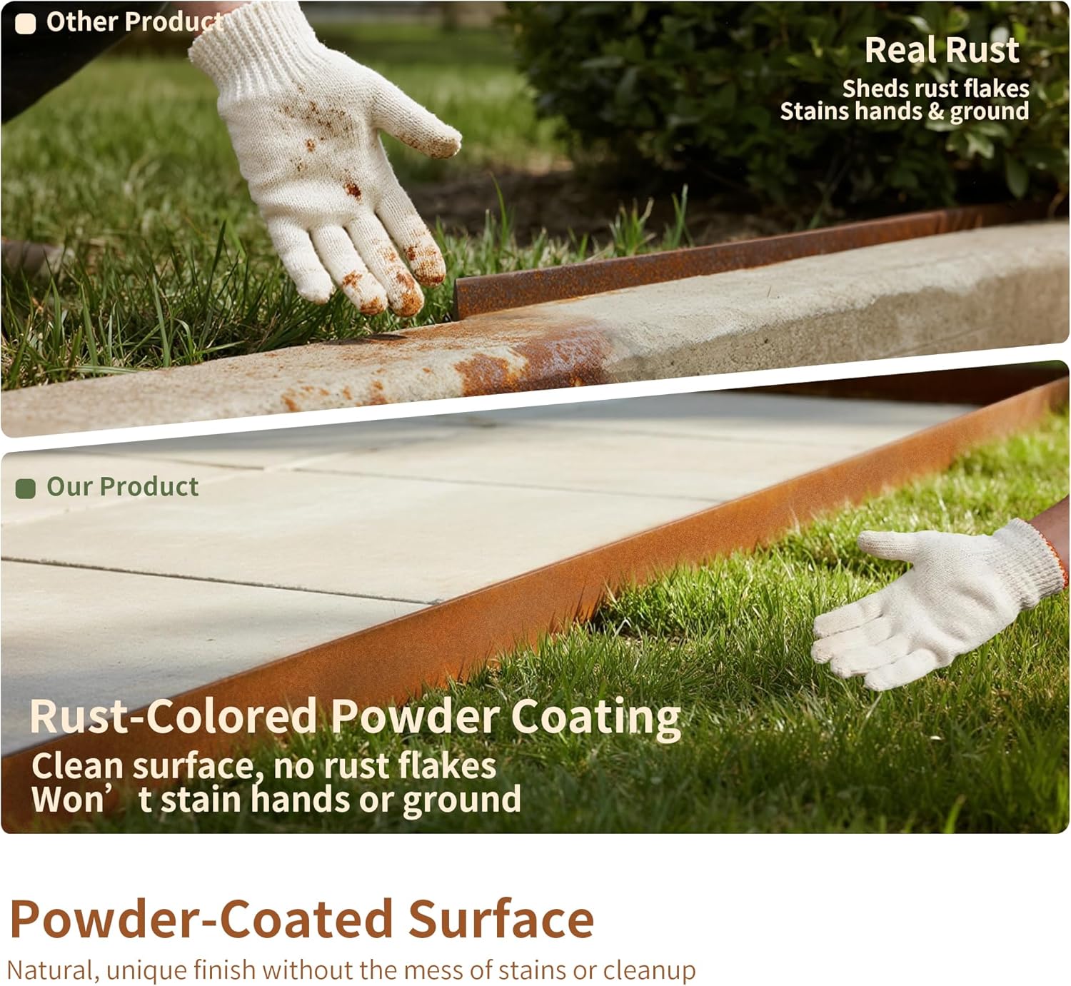 - Rust-Colored Powder Coating β Rust-Colored powder coating offers the charm of natural rust without shedding particles or staining the ground.