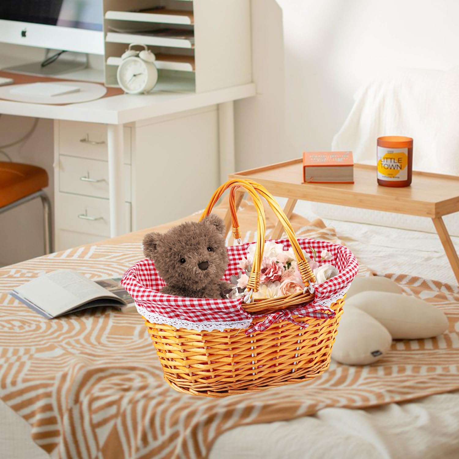 1 Pack 14.2 Inch Natural Wicker Basket with Checkered Lining, Oval Wicker Woven Basket with Handle, Willow Woven Picnic Baskets for Picnic, Camping, Party(Large)