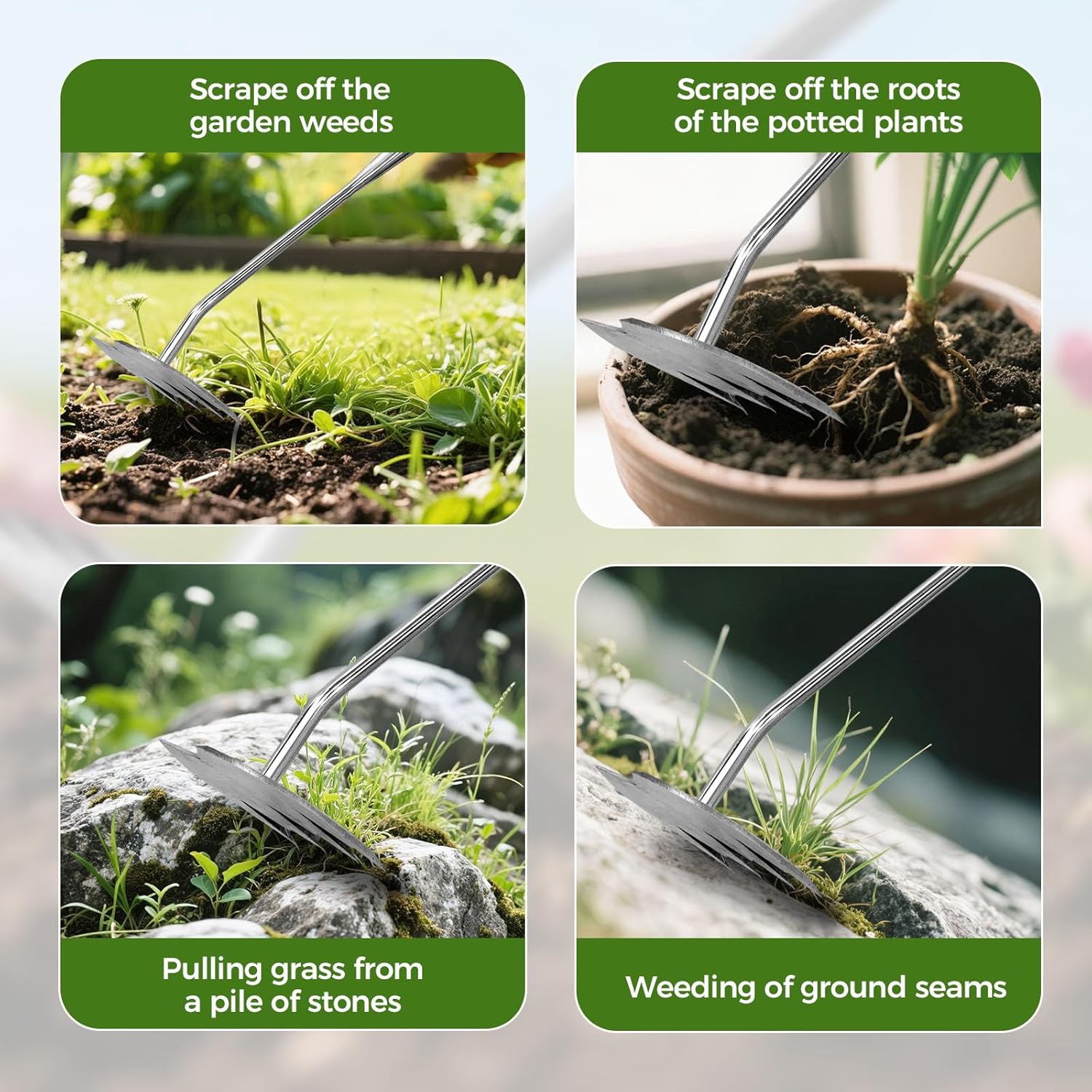 - πͺ [2025 New Upgraded Weeding Tool] With a unique four-tooth structure design, it can complete root prying, soil loosening and weeding with a single operation. Easily deal with deep-rooted thistle weeds and stubborn plants such as dandelions. The newly upgraded extendable handle design is suitable for both standing and squatting positions, providing an efficient and effortless gardening experience.