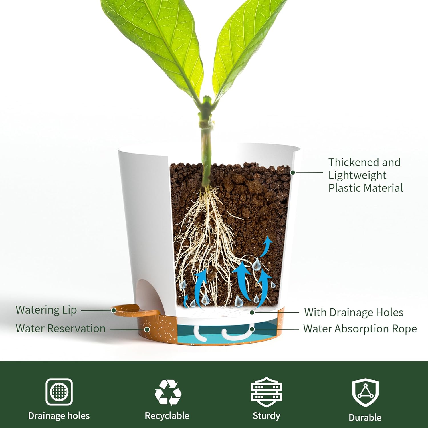 - Self-Watering Planter System: Our 4 inch small self watering plant pots feature a built-in wick rope that draws water from the reservoir, ensuring consistent hydration for your indoor and outdoor plants. Perfect for busy plant owners and those who forget to water!