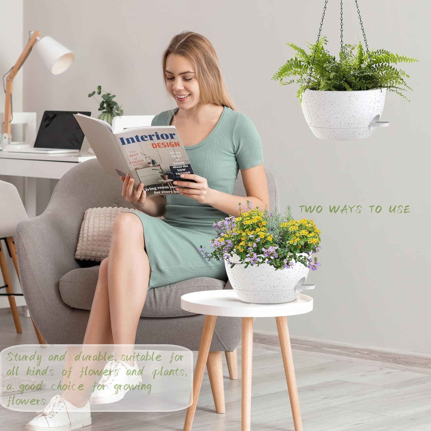 12 Inch Hanging Baskets 2 PC with Chains, Self-Watering Hanging Planters for Indoor Outdoor Plants, Plastic Hanging Flower Pots,Speckled White