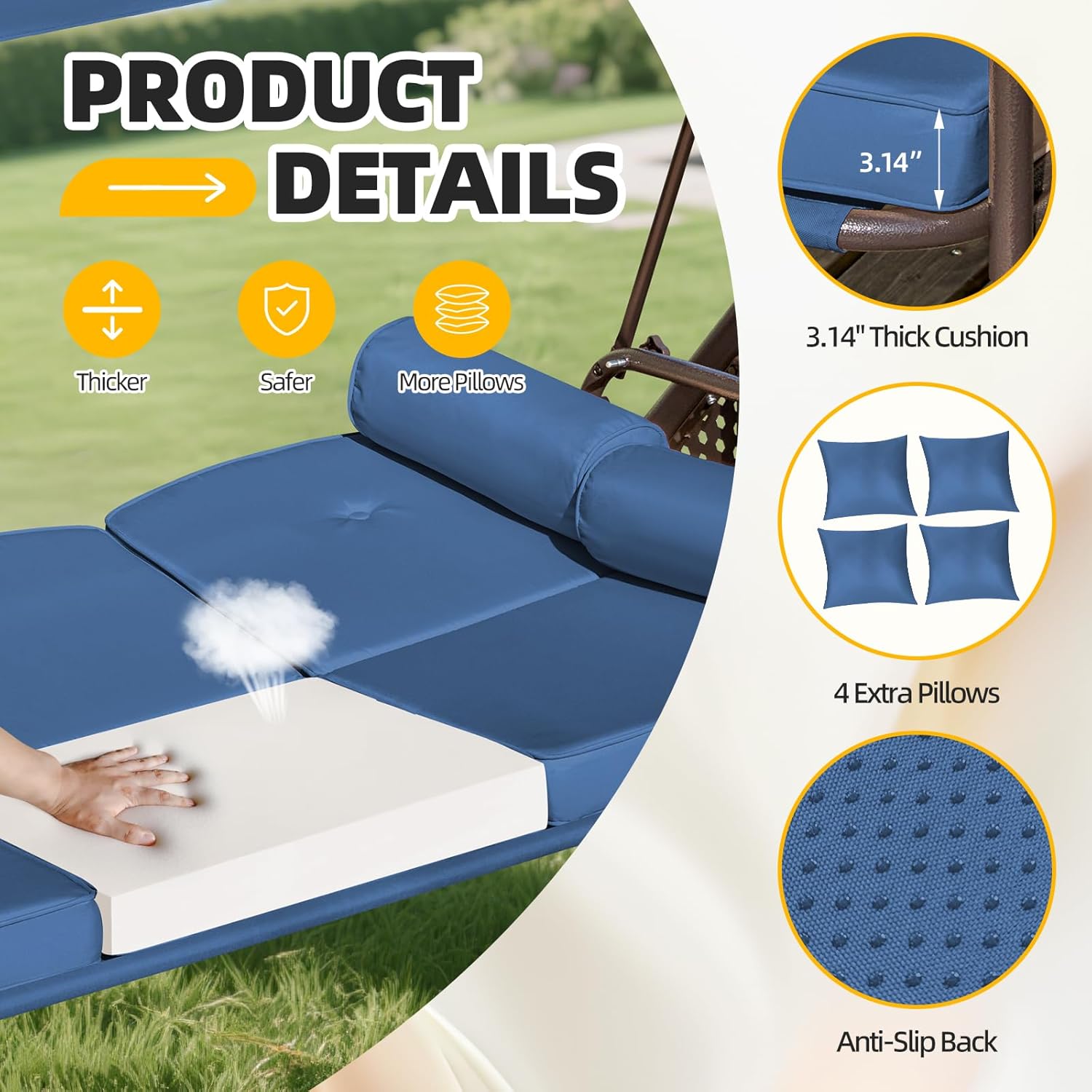 - Anti-Slip Cushion Design for Extra Comfor: Listening to customer, we've upgraded our outdoor swing cushions! The seat cushion now features a bottom layer of rubber anti-slip dots to reduce unwanted sliding and keep your cushion securely in place β even when the swing moves. The thick 3.6-inch cushion, filled with high-resilience sponge, and two headrest pillows provide exceptional comfort and neck support