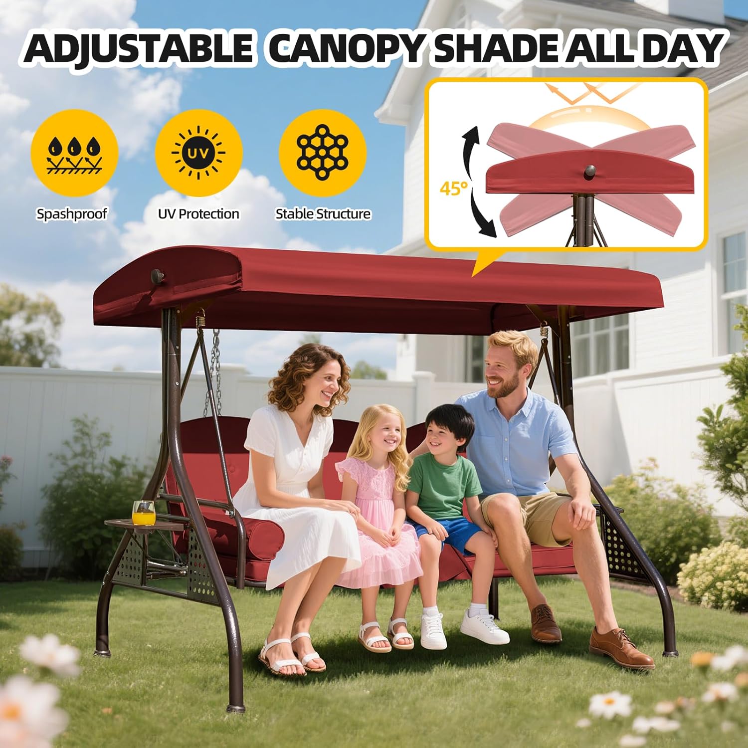 - Upgraded 135Β° Adjustable Hardtop Canopy: Enjoy perfect shade anytime with our upgraded patio swing with canopy! The 3-seat porch swing with canopy features a hardtop adjustable up to 135Β°, so you can read, nap, or relax without worrying about harsh sun or unexpected rain. Effortlessly set the suitable angle by turning the sturdy side knob, making this outdoor swing ideal for every moment outdoors