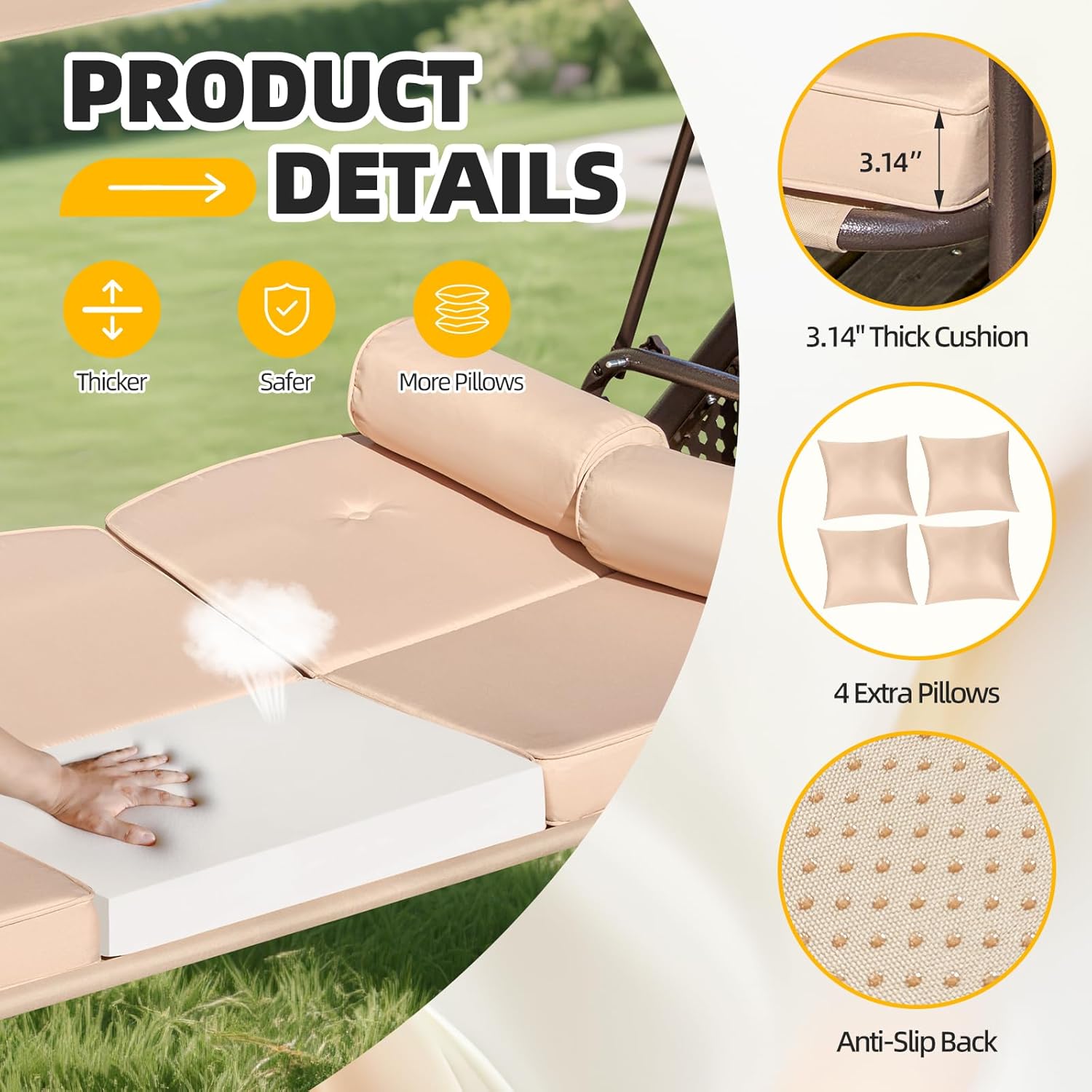 - Anti-Slip Cushion Design for Extra Comfor: Listening to customer, we've upgraded our outdoor swing cushions! The seat cushion now features a bottom layer of rubber anti-slip dots to reduce unwanted sliding and keep your cushion securely in place β even when the swing moves. The thick 3.6-inch cushion, filled with high-resilience sponge, and two headrest pillows provide exceptional comfort and neck support
