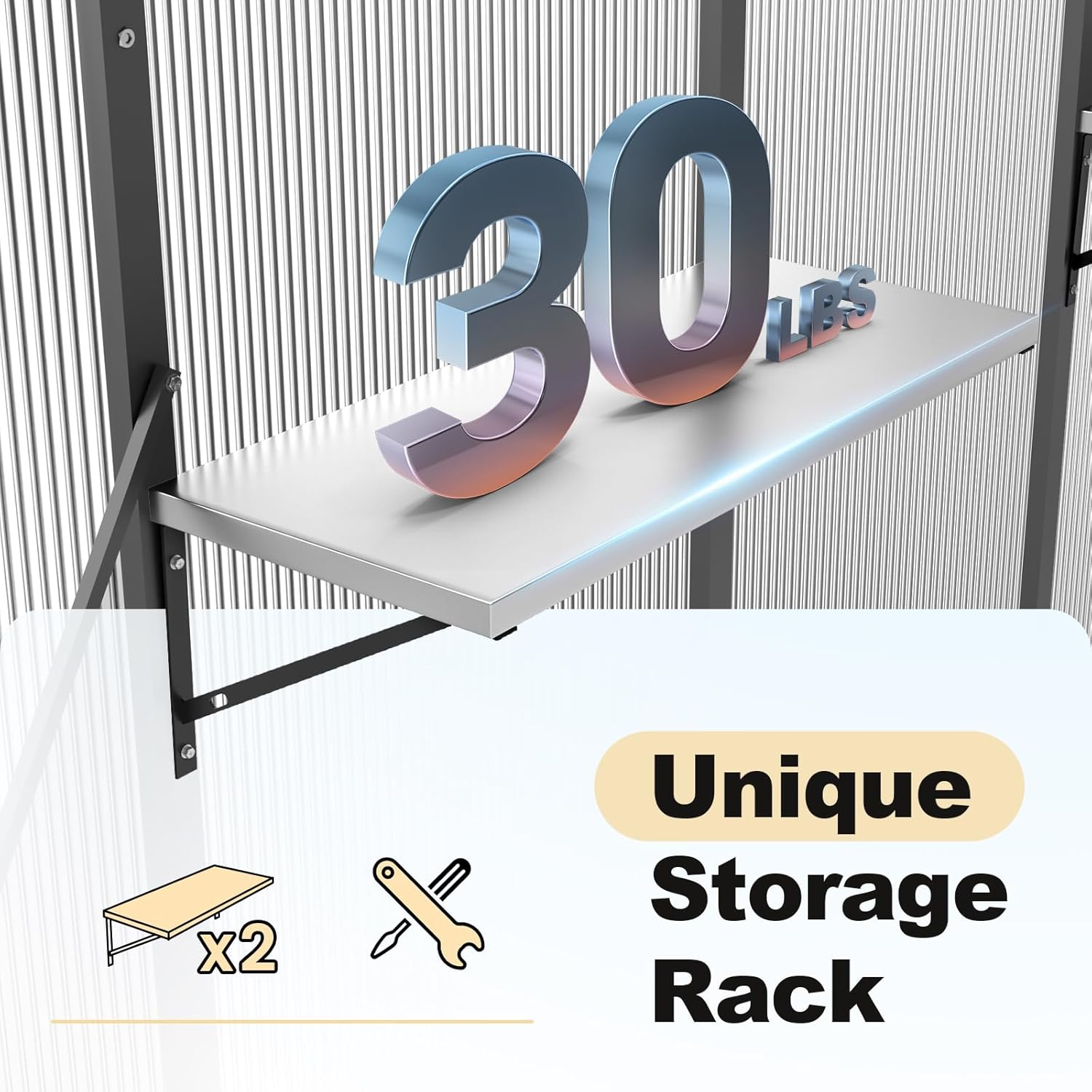 - [Unique Storage Racks]--The product comes with 2 storage racks. The integrated design ensures good aesthetics. Each rack can bear 30 lbs of weight. You can easily place other common tools such as kettles, shovels, etc. on the shelf for easy access, or you can place small flower pots, decorations, etc. to decorate your greenhouse.