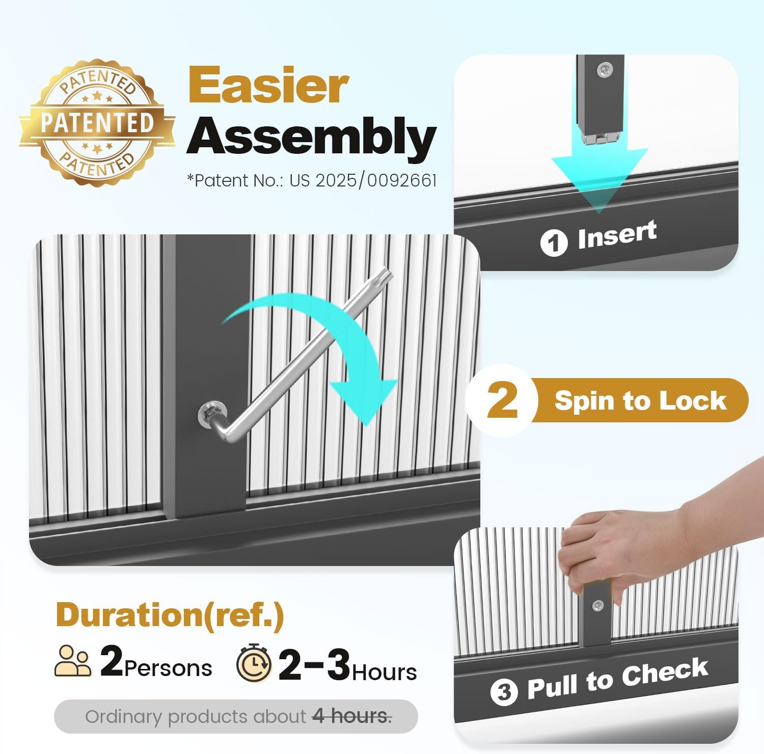 - [Quick-Connect Frame]--This KING BIRD polycarbonate(PC) greenhouse is built with aluminum sturdy frame. The patented(No. US 2025/0092661) Kuick-connect system simplifies the process which reduces 60% installation time, allowing 2-3 people to easy assemble in 2-5 hours (varied with sizes) under our concise and clear instructions/video compared to other unauthorized items.