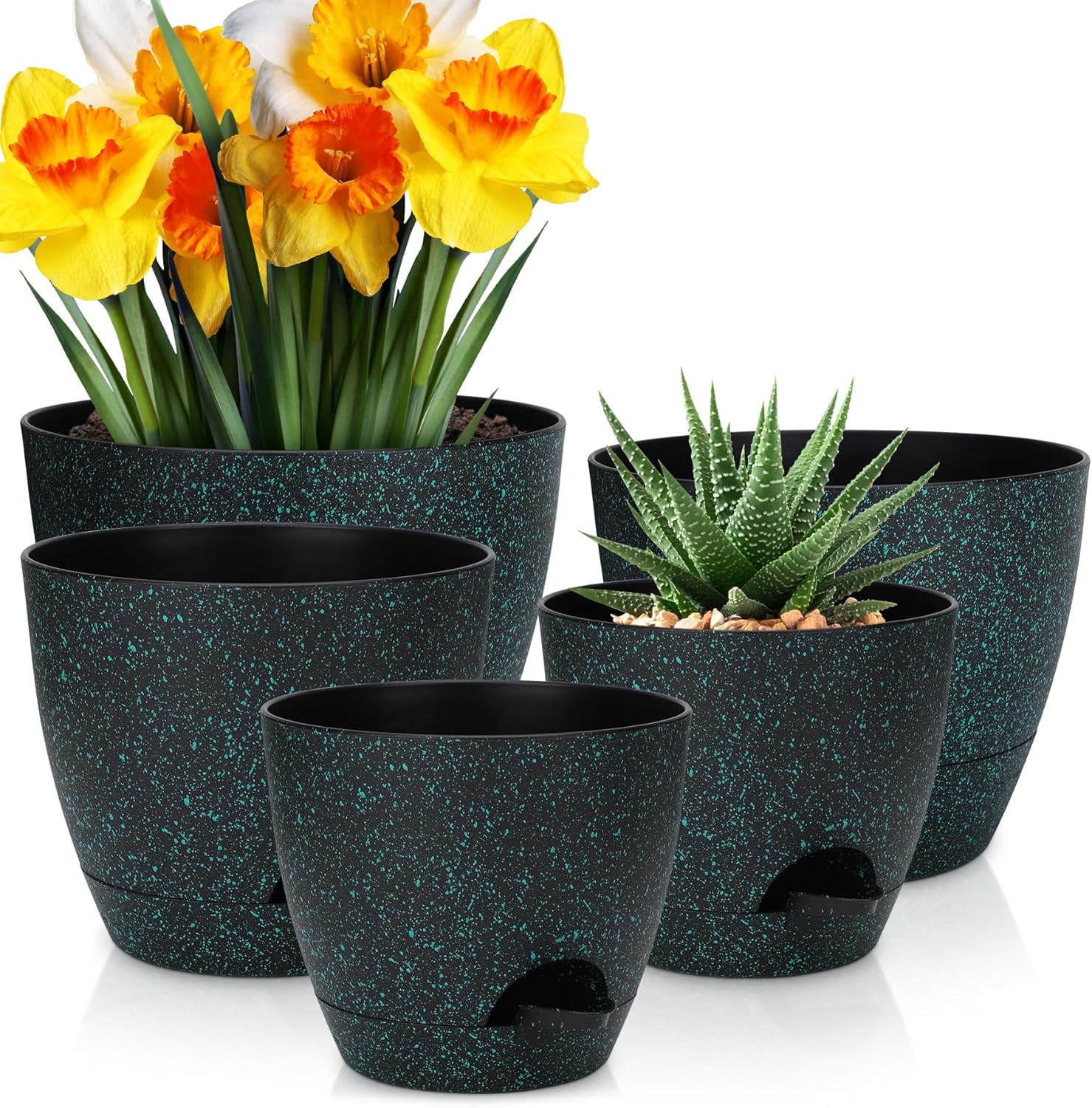 Plant Pots 10/9/8/7.5/7 inch, Self Watering Planters with Drainage Holes & Saucers for Indoor and Outdoor Plants (Green Speckles)