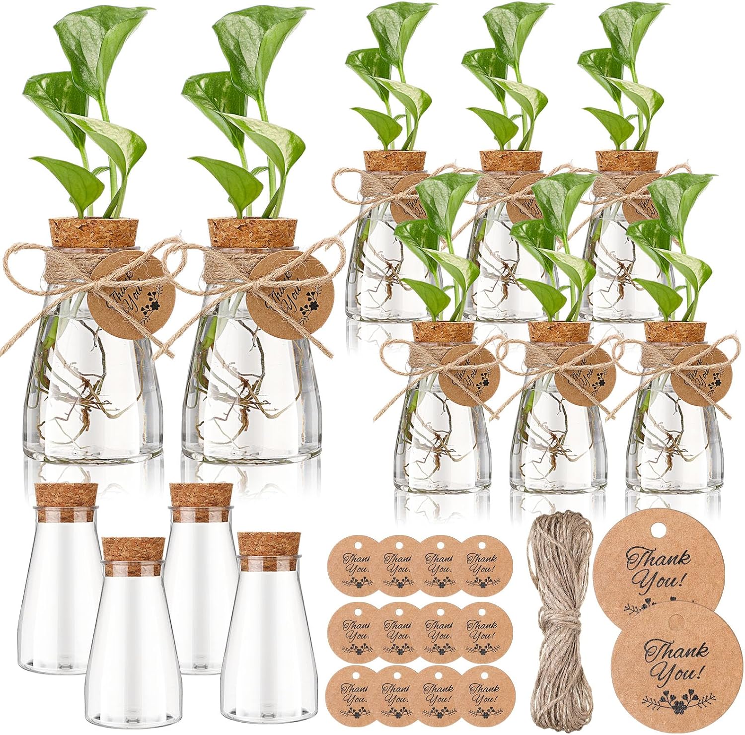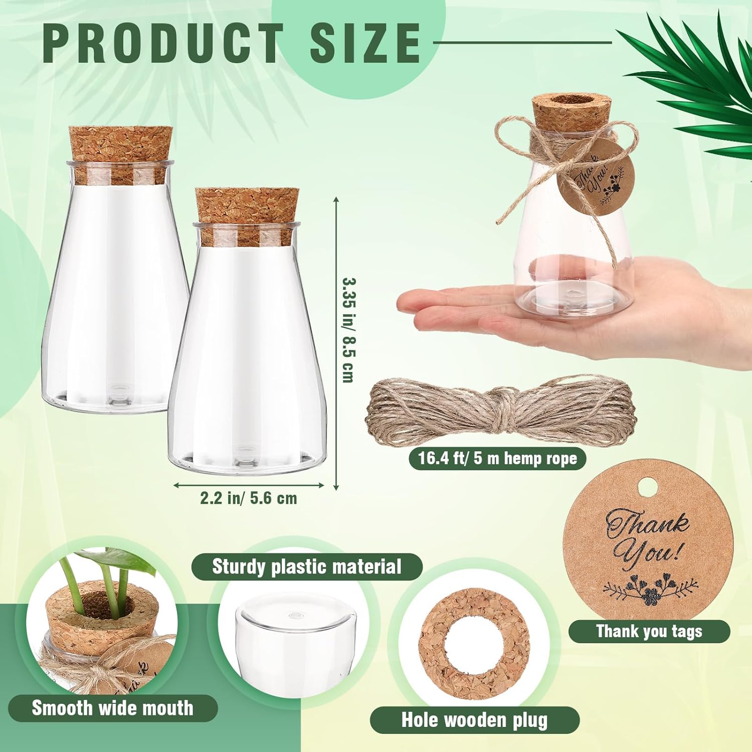 - Multiple Combinations: including 12 plastic plant cultivation bottles, 12 perforated wooden plugs, 24 thank you tags, and 16.4 ft/ 5 m hemp rope, which can meet your various plant needs and are suitable for plant lovers; The transparent material can observe the growth of plants and changes in water levels, and the appropriate size also provides space for plant growth