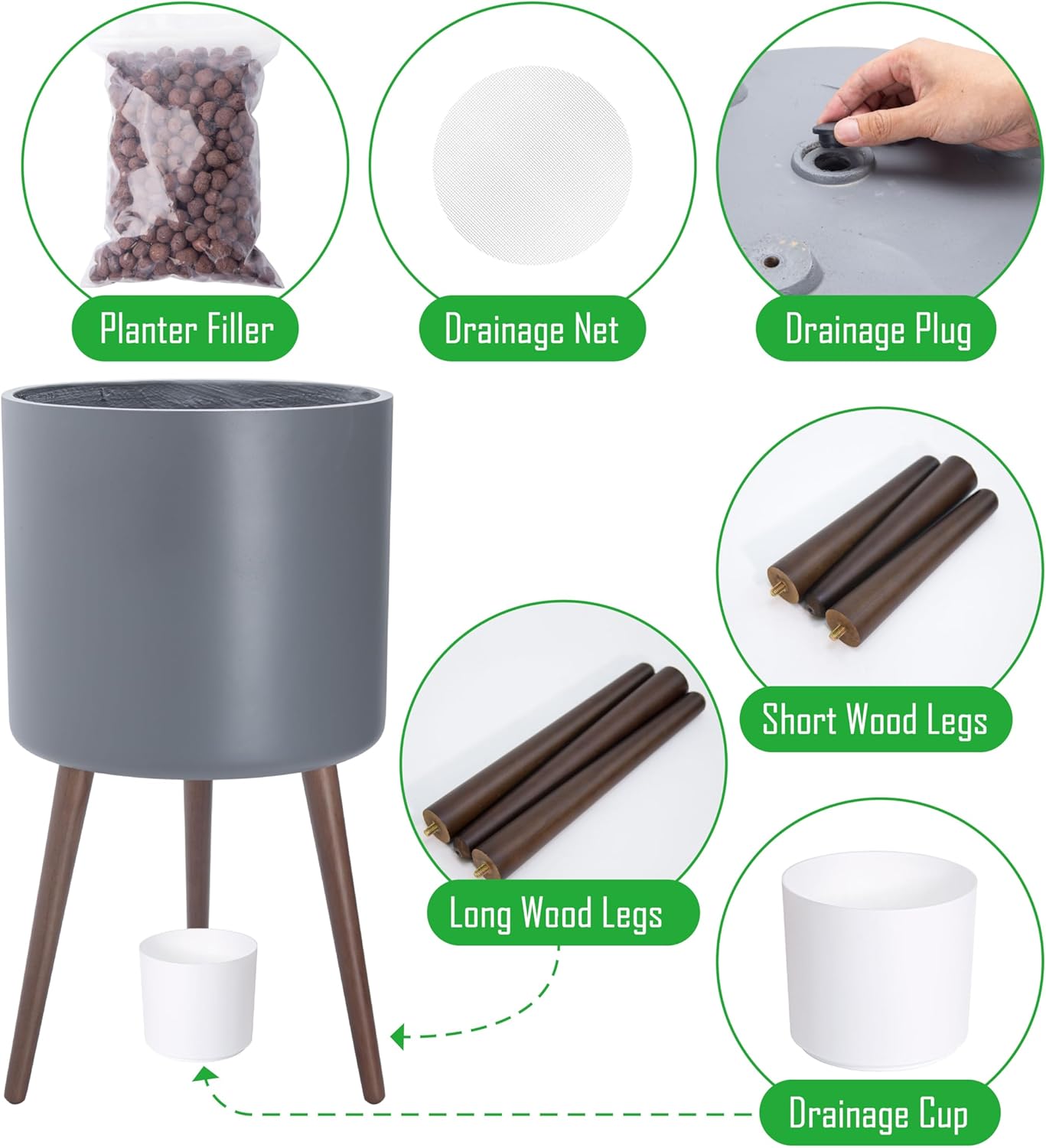 - Functional Accessories: Includes a drainage hole, optional plug, mesh net, water catch cup, and ceramic fillers for optimal plant care.