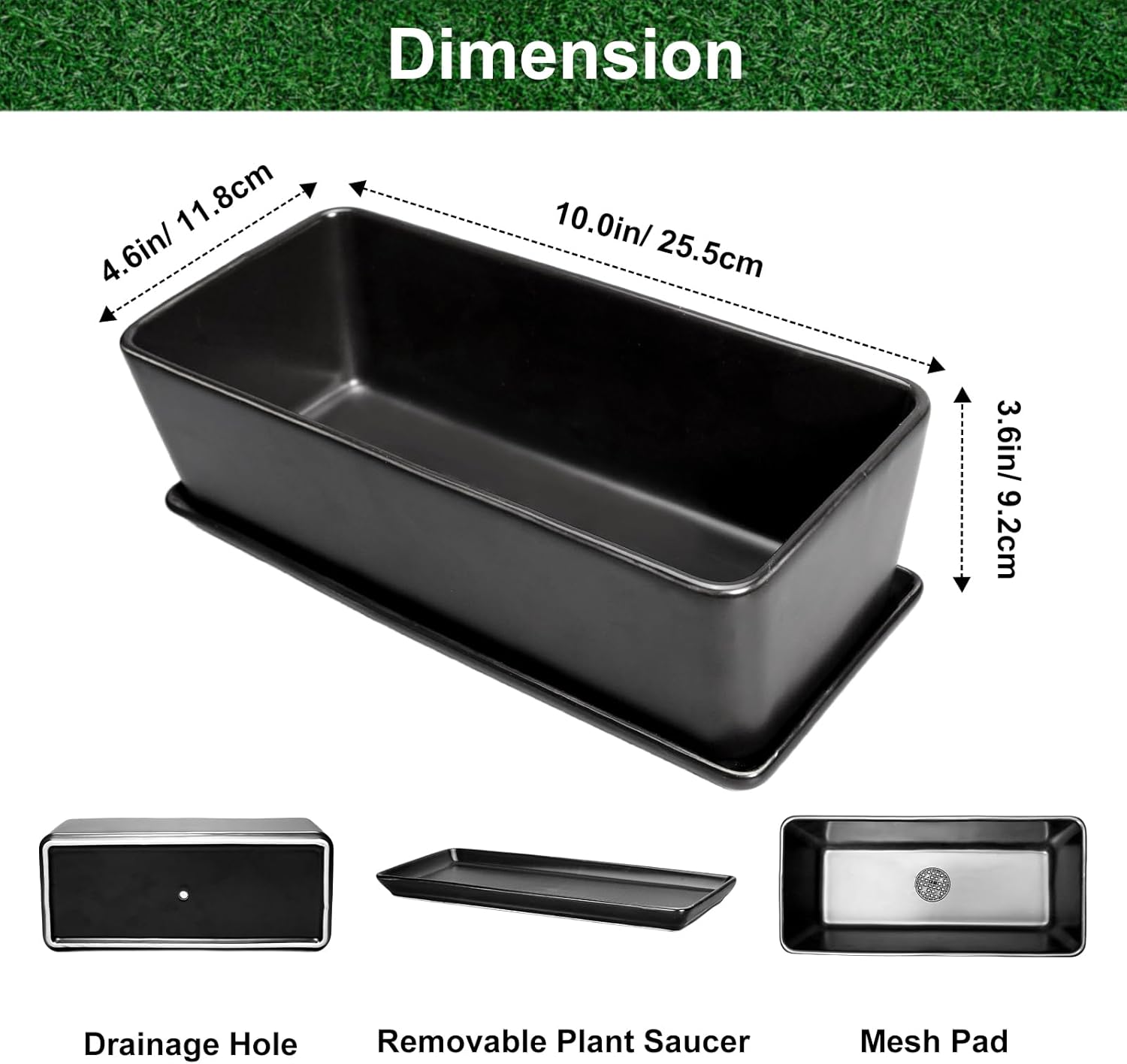 SQOWL Rectangle Planter - 10 Inch Ceramic Plant Pots with Drainage Hole and Saucer, Rectangular Succulent Planters for Indoor Plants, Flower Cactus Herb Pots Outdoor, Room Decor, Garden Gifts, Black