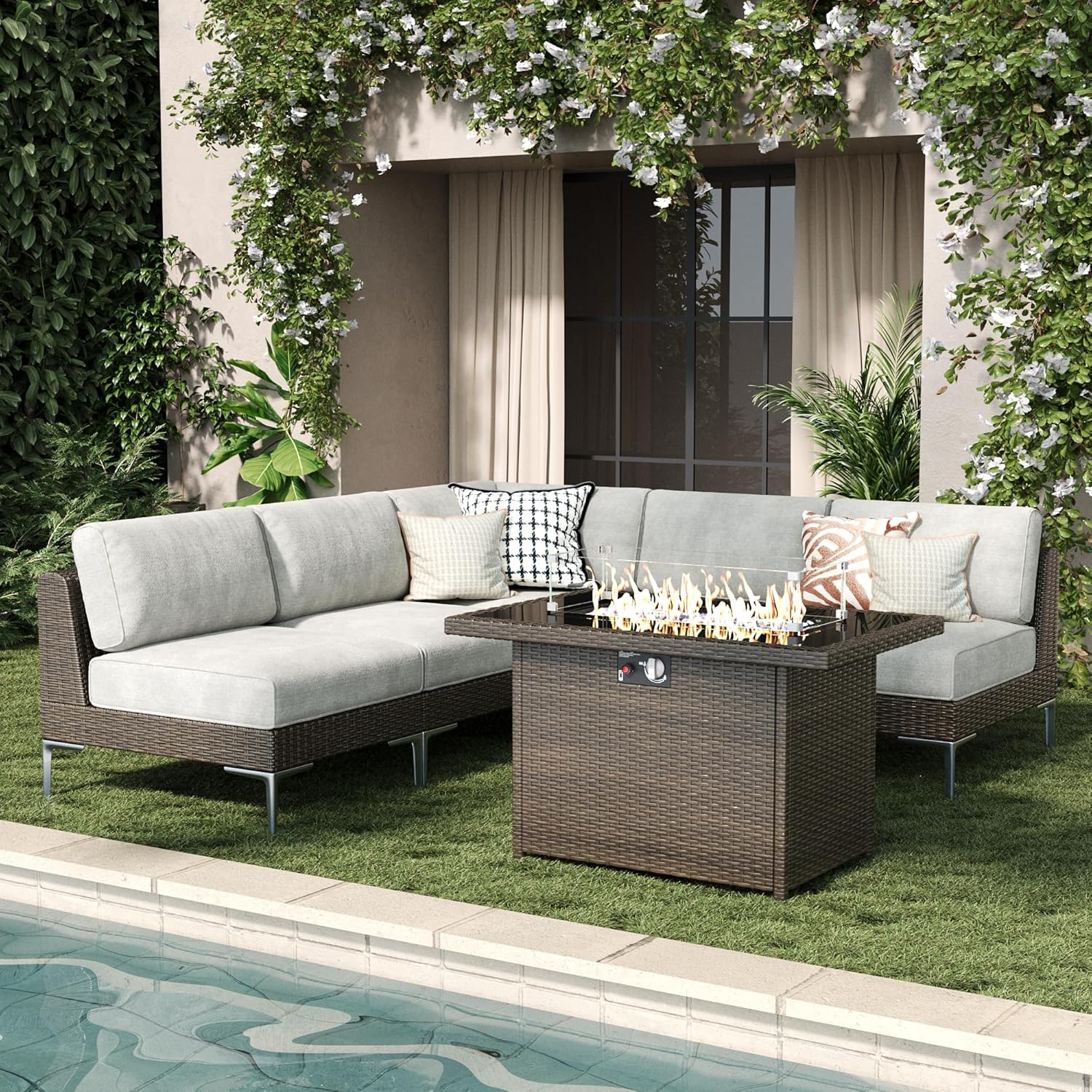 LayinSun 6-Piece Outdoor Modular Wicker Sectional Sofa with Fire Pit Table, Patio Furniture Conversation Set with Deep Seating and Thick Cushions