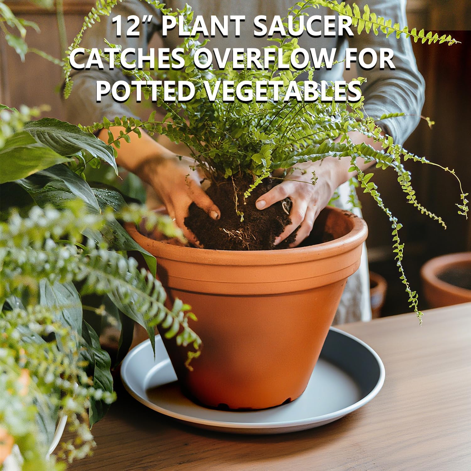 - 【6 Pack 12 Inch Gray Plant Saucers】 Includes 6 pcs durable 12 inch round plant saucers, approx. 11.6" outer diameter, 10" inner diameter, 1.25" height, 163 g each. Slight manual measurement differences do not affect normal use.