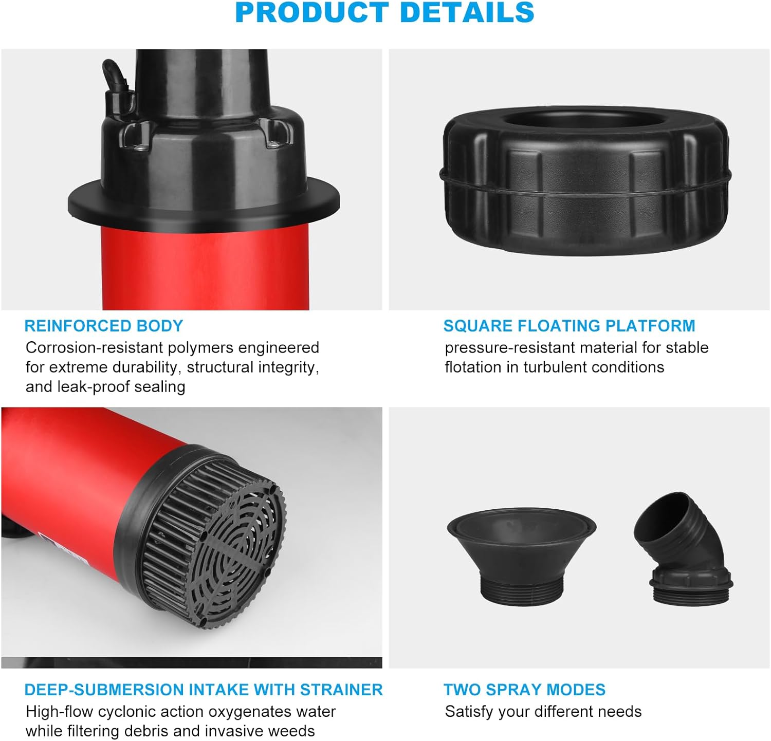 - 【Durable Aeration Design】Equipped with an energy-efficient 1HP pump (750W, 110V) and a high-quality PVC float, this aerator ensures long-lasting performance in various weather conditions and water environments. This pond aerator is ideal for enhancing outdoor ponds, lakes, landscape fountains, aquaculture setups, and irrigation systems. It helps promote cleaner, healthier, and more vibrant water.