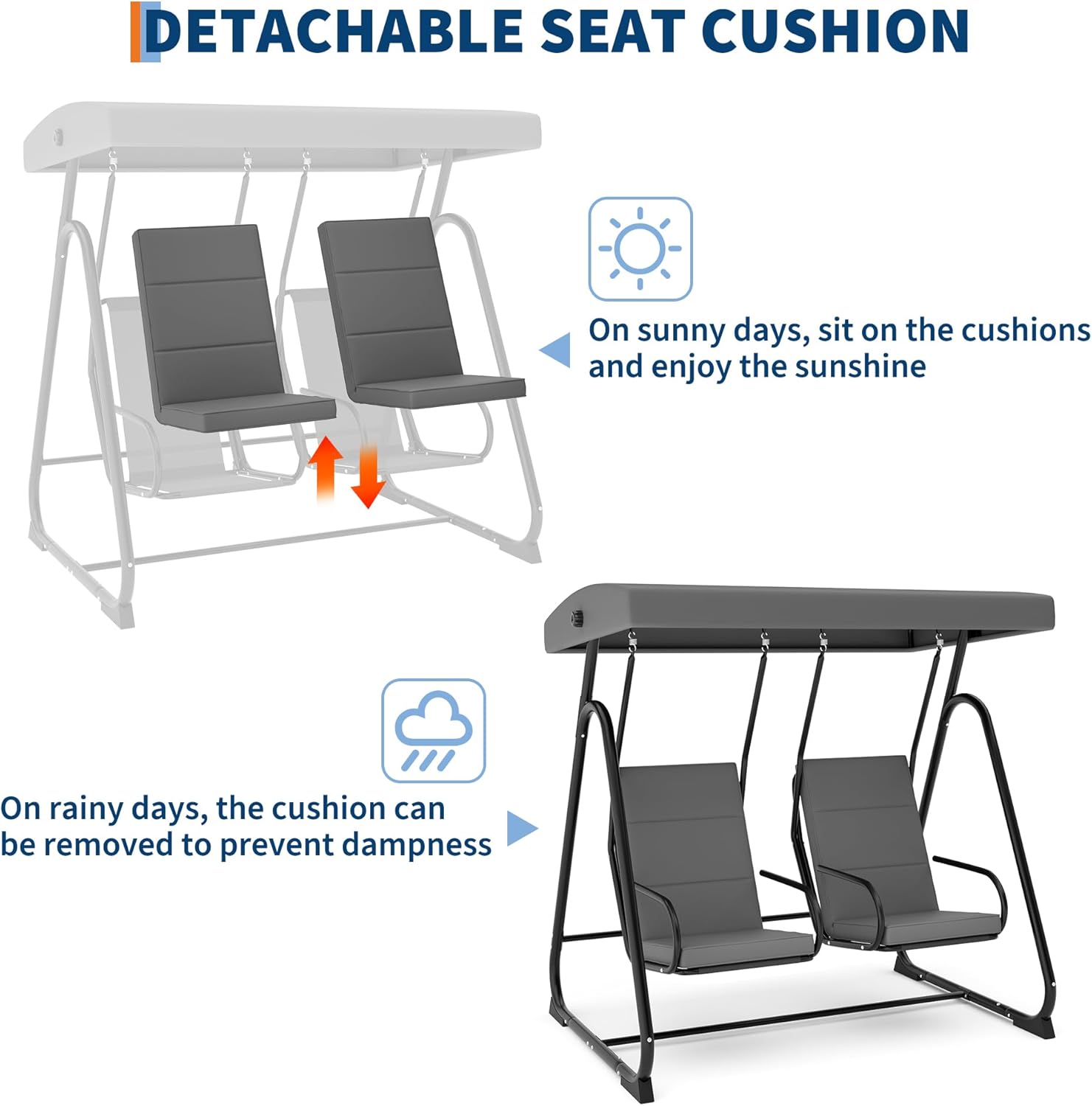 - Spacious 2-Person Patio Swing Chair: Comfortably seats two with independent cushioned seats and built-in handrails, offering a relaxing and private space for conversation or rest.