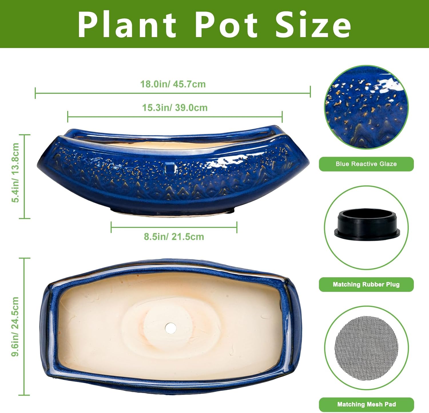 - Sufficiently Large Size: Our ceramic plant pot is 18.0''/45.7cm X 9.6''/24.5cm X 5.4''/13.8cm. Packaging Includes: a ceramic planter, drainage plug, and mesh pad. Thoughtfully packaged to ensure your bonsai tree pot arrives in complete condition