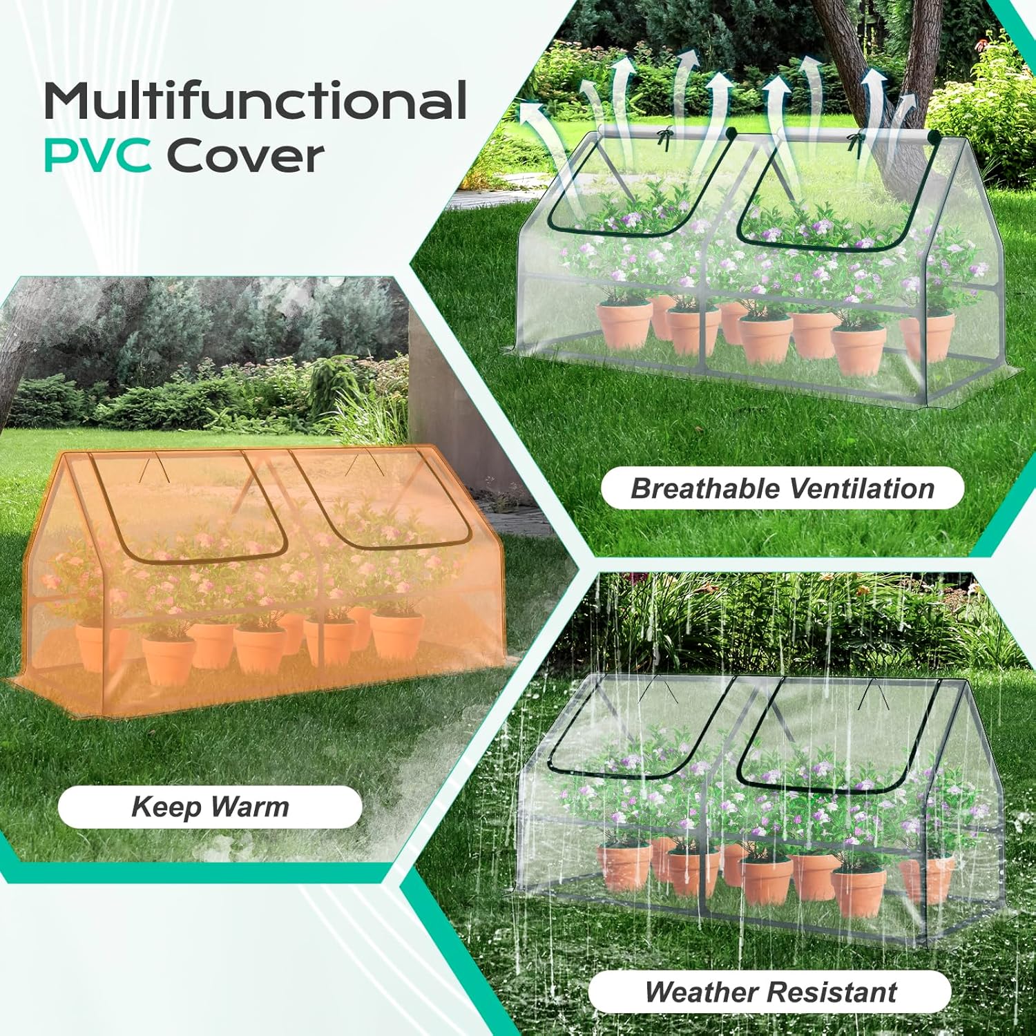 - Durable All-Season PE Cover: Part of our premium greenhouse kits, the durable PE cover / PVC cover shields plants from harmful UV rays and inclement weather, while preserving heat and moisture during colder months