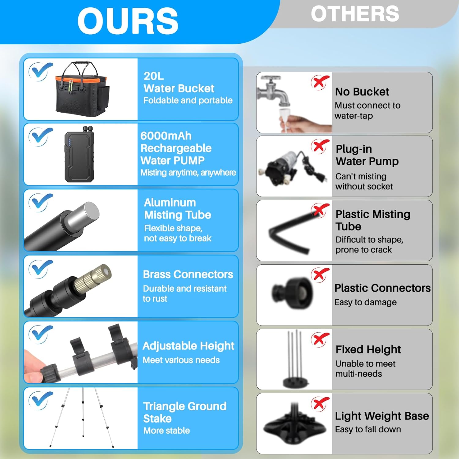 Portable Misting System with Standing, 6000mAh Water Cooling Misters Set for Outside Patio - 20L Bucket, 4.9FT(59IN) Adjustable Height for Outdoor, Beach, Pool, Water Playing, Sprinkler, Camping