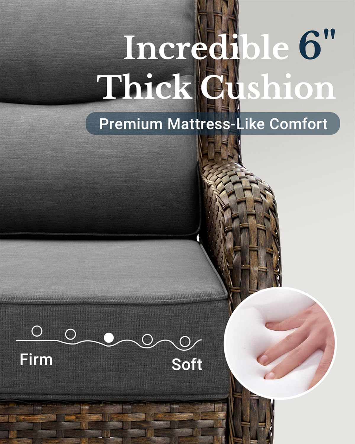 - 6-Inch Thick Seat Cushions: Each cushion on our patio swivel chair and sofa features 6-inch thick, 28D high-density foam—delivering up to 40% more depth, 30% better bounce-back, and 2x the durability compared to the standard 4-inch cushions found in most outdoor sets. Sit back, relax, and feel the lasting difference