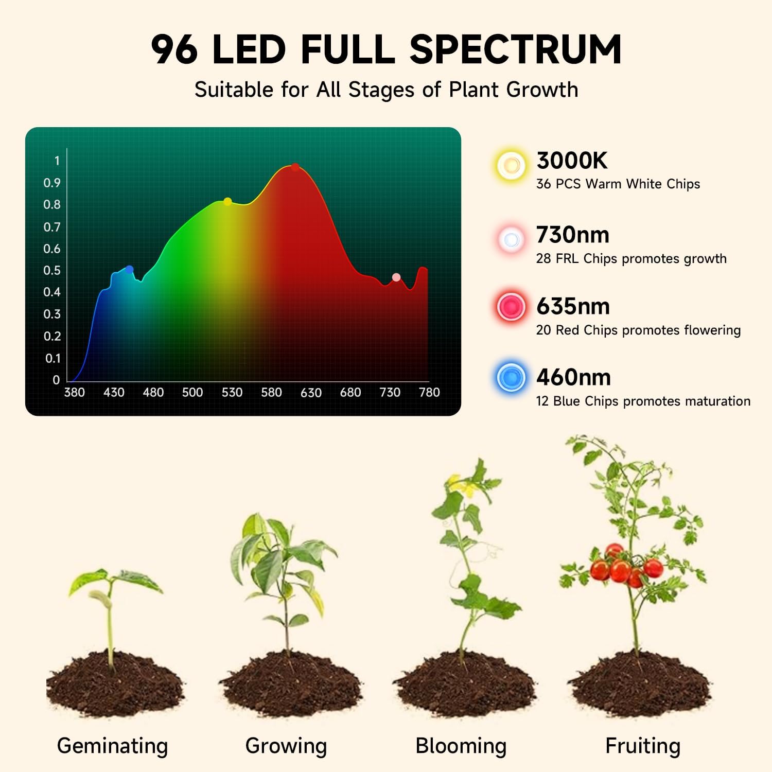 - 【Full Spectrum Light】The hemispheric lamp design enables a wider illumination range. It contains 96 LEDs and provides full-spectrum light. Among them, there are 12 blue LEDs (460nm), 20 red LEDs (635nm), 28 far-red light LEDs (730nm), and 36 warm white LEDs (3000K). Improve the growth rate and meet the light energy demand of plants in the whole process of germination, growth, flowering and fruiting.