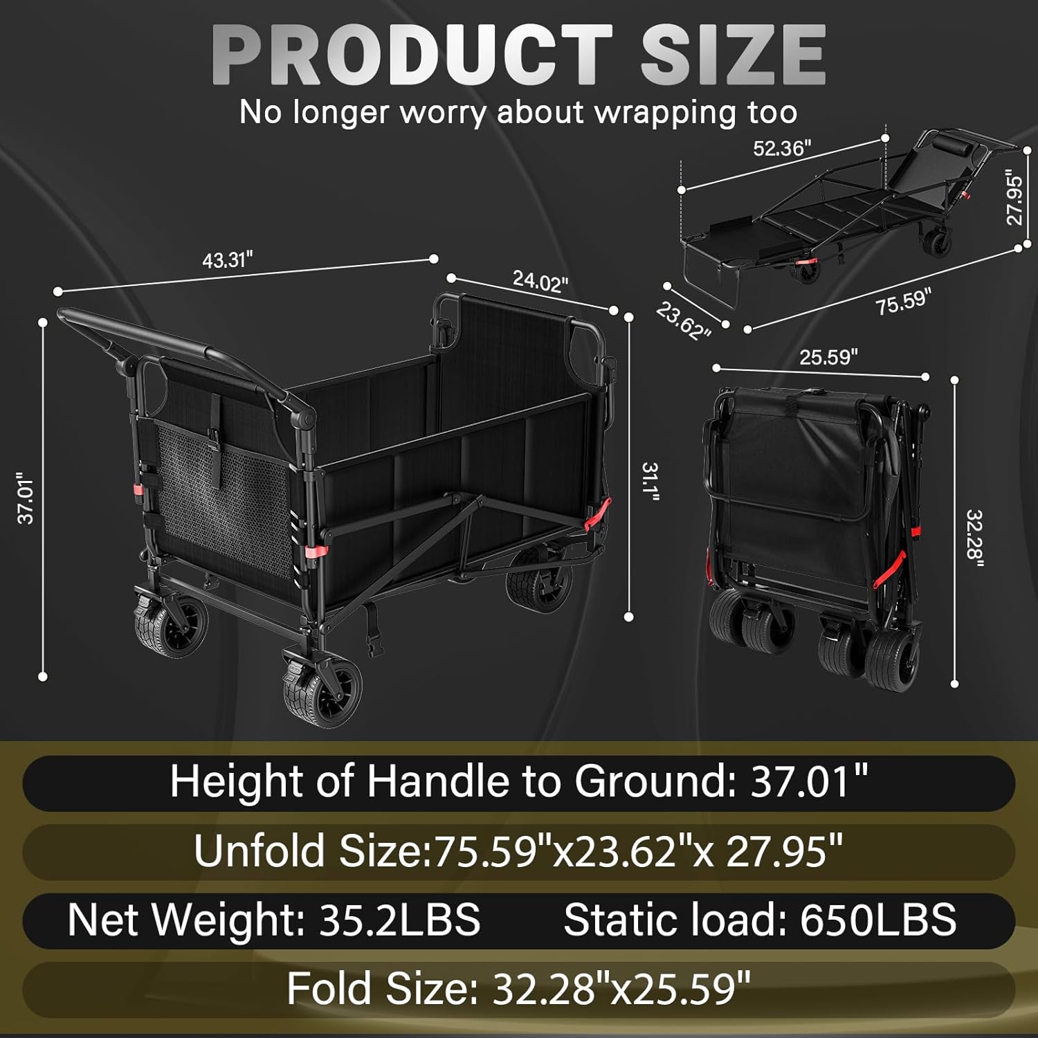 LEVELEVE Heavy Duty Folding Wagon - 2-in-1 Collapsible Cart, 650lb Capacity, All-Terrain Wheels w/Brakes & Side Pockets (Black)