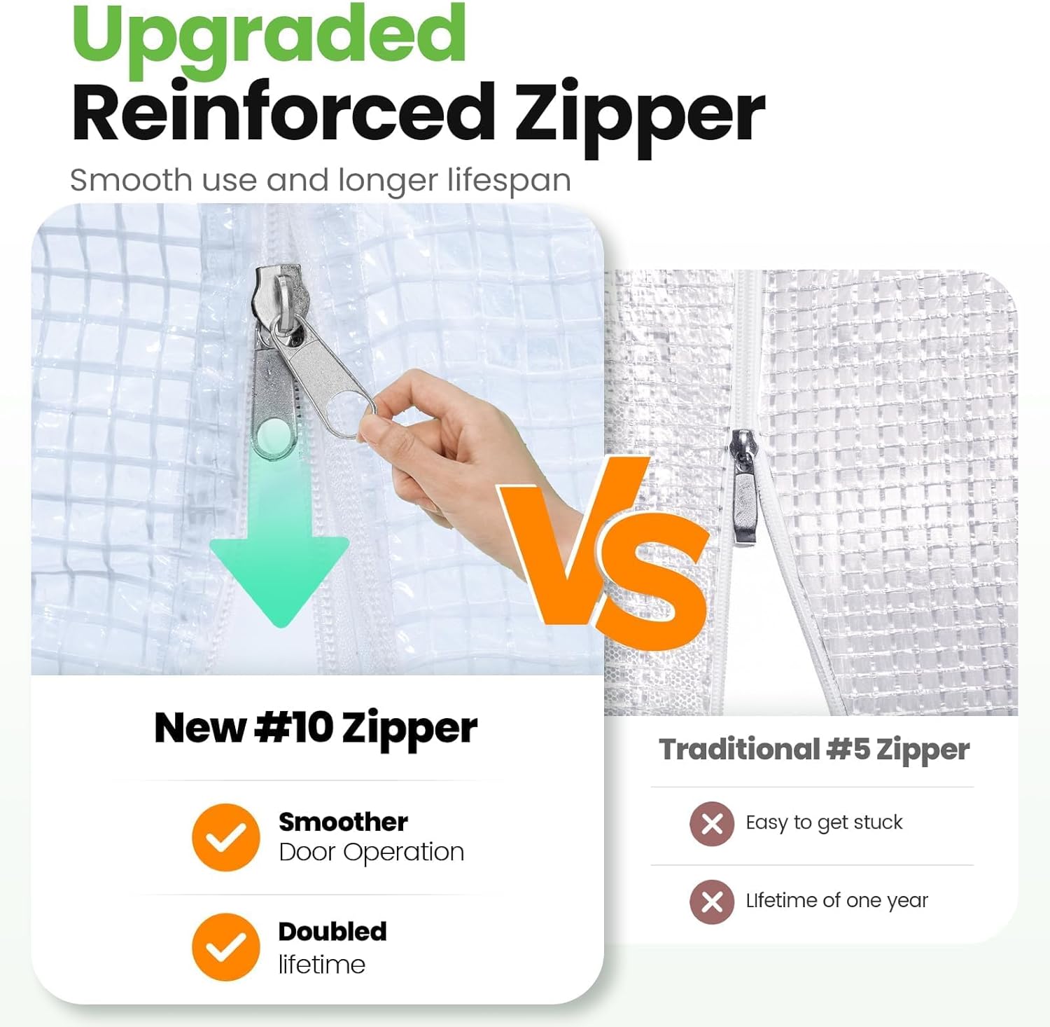 - [UVI 6 Protected Cover]--Waterproof 150g/sqm PE grid cover is UV Index 6 protected, protects your plants from excess rays, which doubles the service life: Compared to other greenhouse(UVI 1-3) that only lasts for 1-6 months, the KING-cover lasts for over years. The reinforced odorless PE covering material provides safe work zone. The cover fits the frame closely, enhancing warmth and wind resistance.