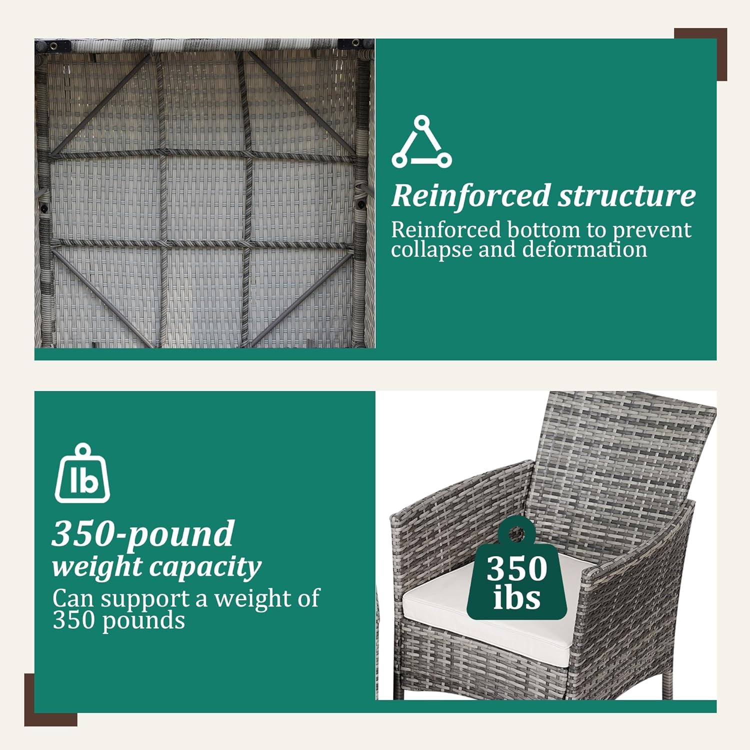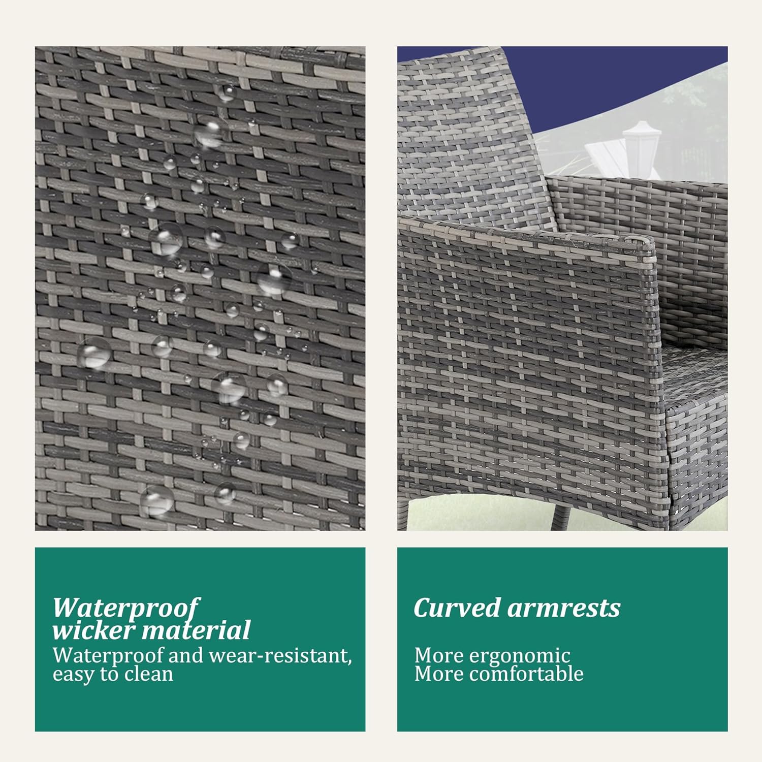 - 【Complete 3-Piece Set】 Includes 5 main furniture (1 Coffee Table + 2 Chairs + 2 Seat Cushions). Everything needed for instant outdoor living