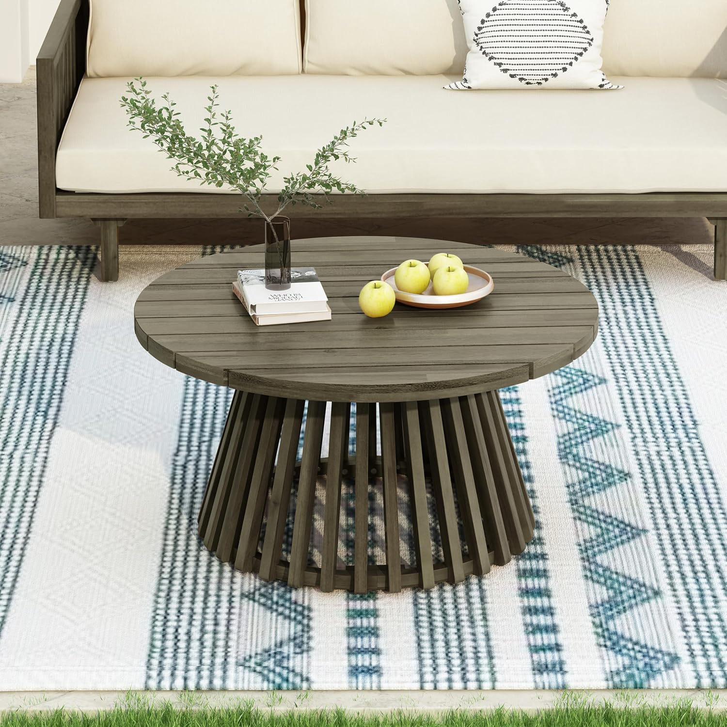 - Round Outdoor Coffee Table: With a slatted base and circular top, the 16β high coffee table supports up to 215 lbs. Ideal for drinks, snacks, or dΓ©cor, it adds both practicality and elegance, completing the look of your outdoor living area with ease