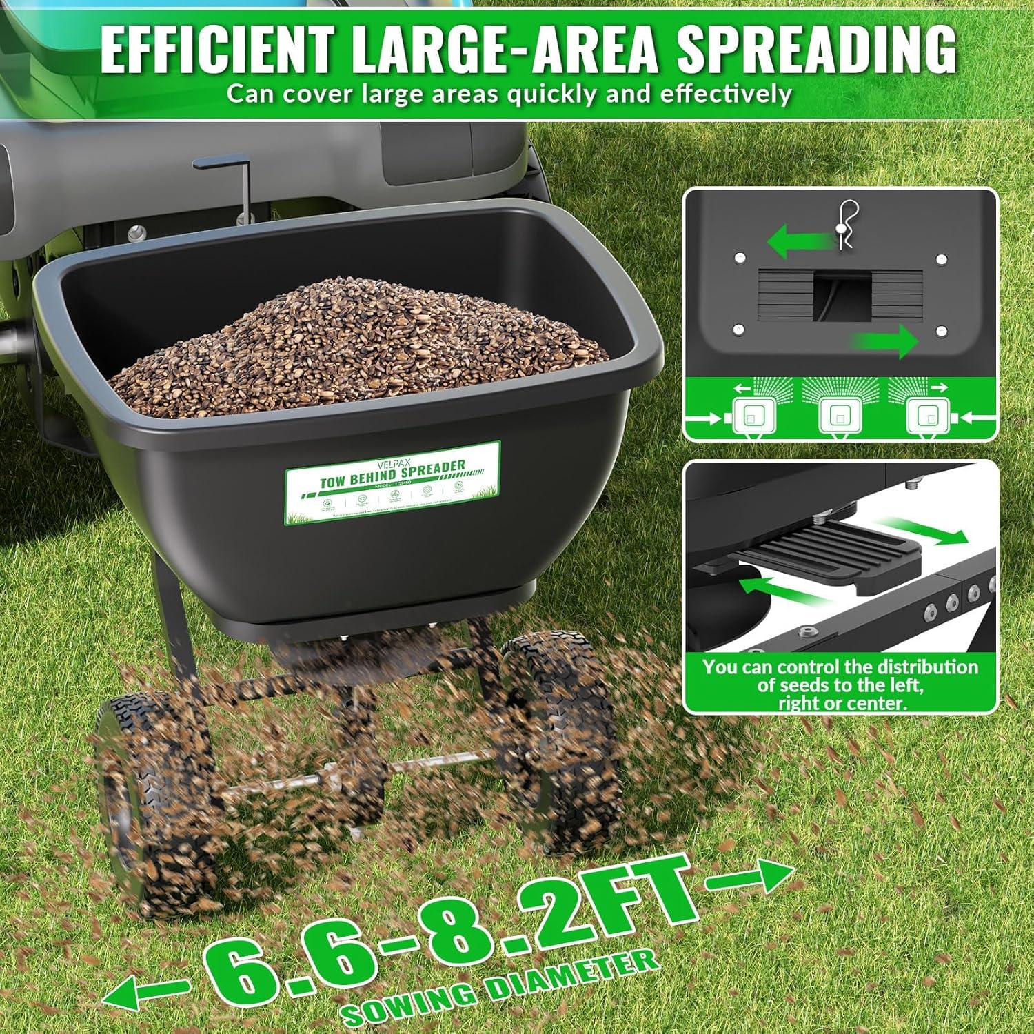 - 【Versatile Applications】-This pull behind spreader is built for year-round lawn and garden care. Whether you're planting seeds, fertilizing, or tackling seasonal maintenance, it ensures efficient, even coverage across up to 50,000 square feet. Designed for versatility and ease of use, this spreader helps you maintain a lush, healthy lawn with minimal effort, no matter the season.