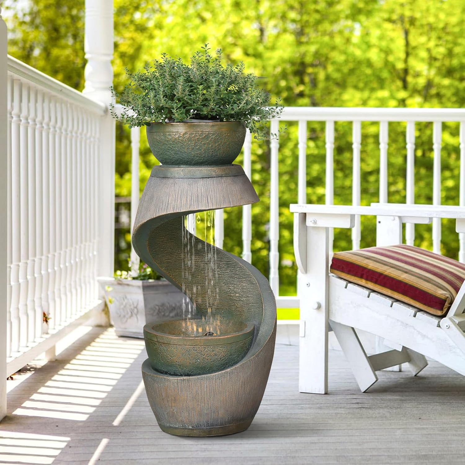 - S-Shaped Modern Water Feature with Decorative Planter This S-shaped modern water fountain brings a sculptural aesthetic to your outdoor space. Designed with a built-in planter bowl on top, it offers a decorative water feature with planter function—ideal for adding greenery to your garden, balcony, or deck. A perfect choice for resin garden fountains outdoor enthusiasts.