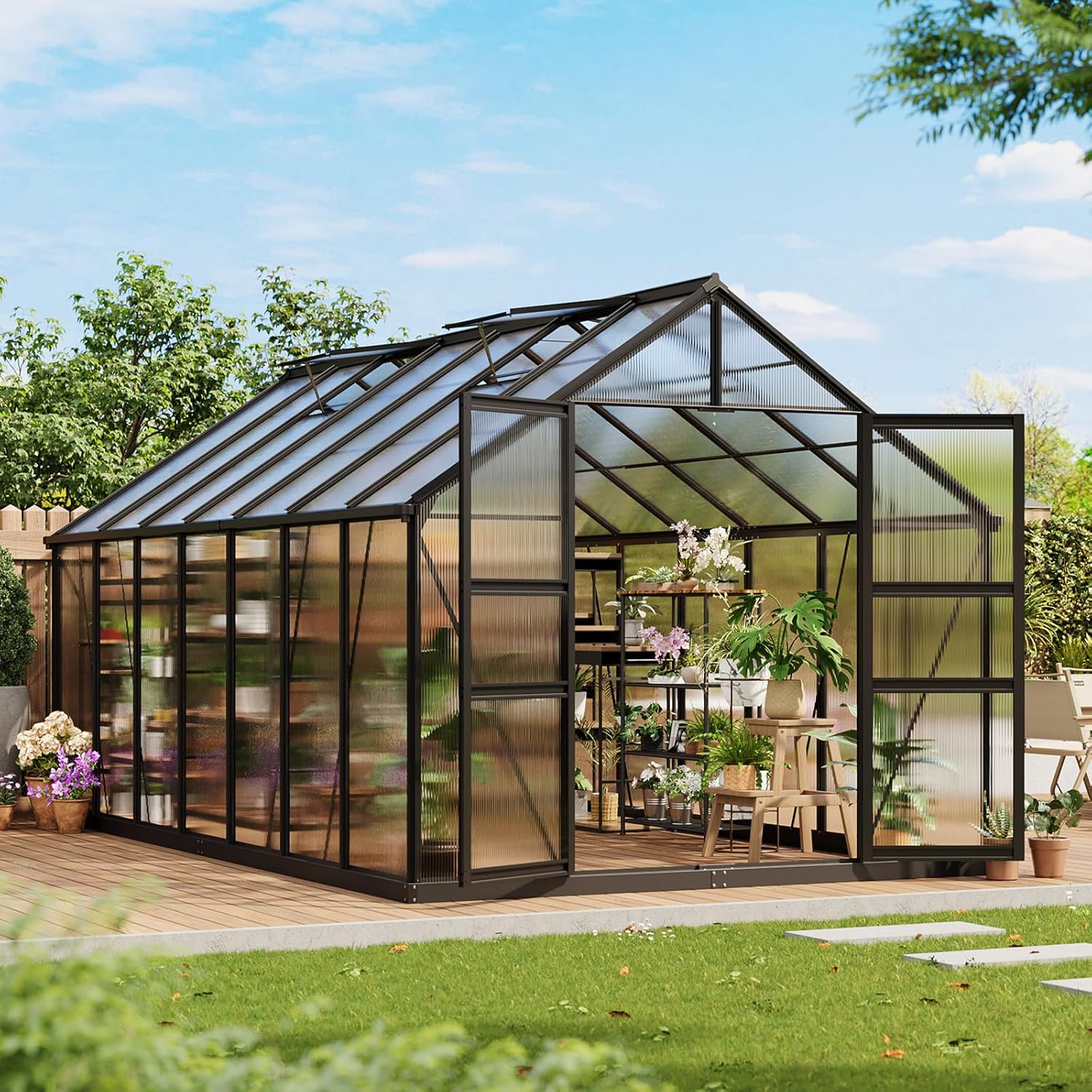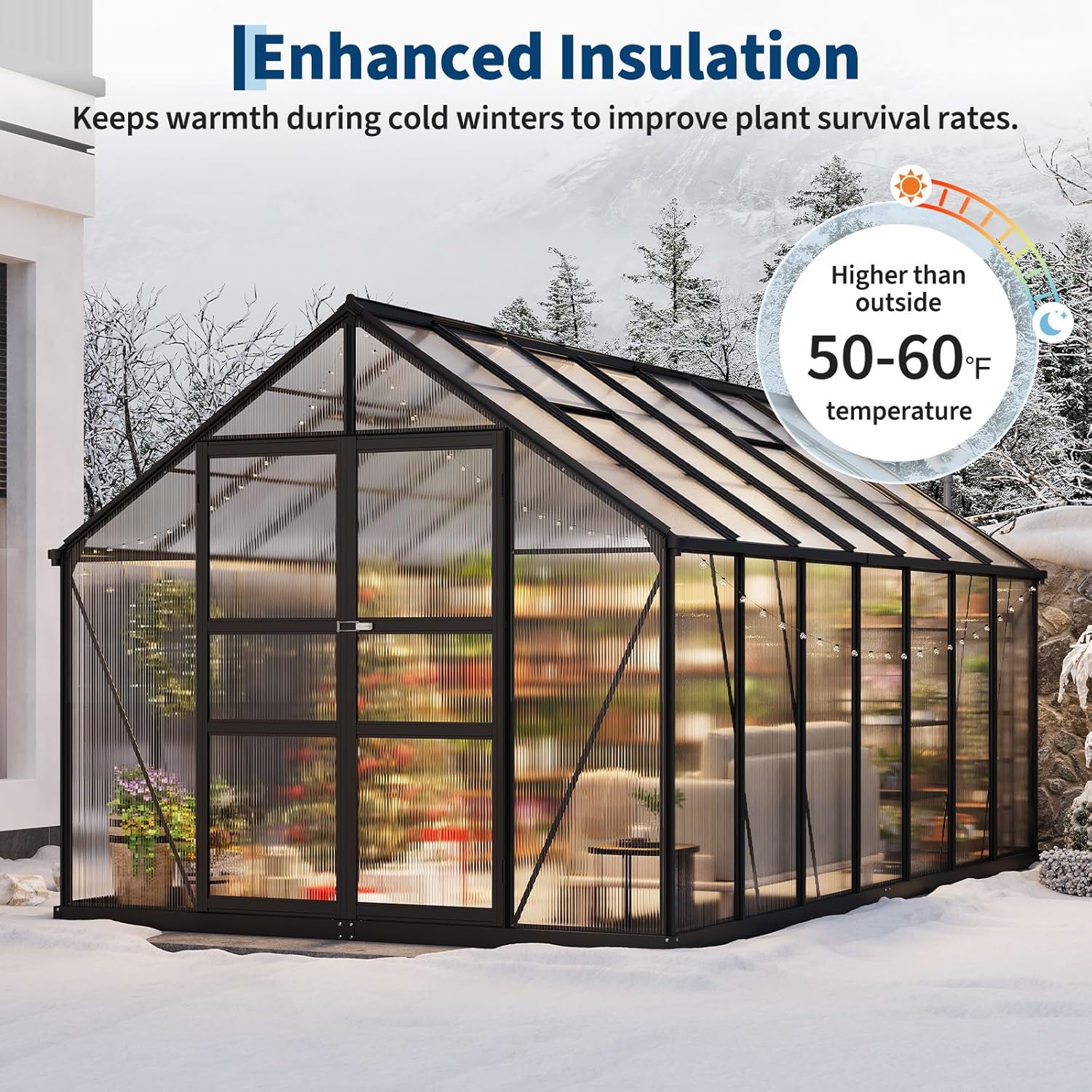 8x14 FT Polycarbonate Greenhouse,Large Walk-in SturdyOutdoor Aluminum Frame Greenhouse with Roof Vent, Lockable Push Door,for Garden, Backyard, Patio & Lawn(Black)