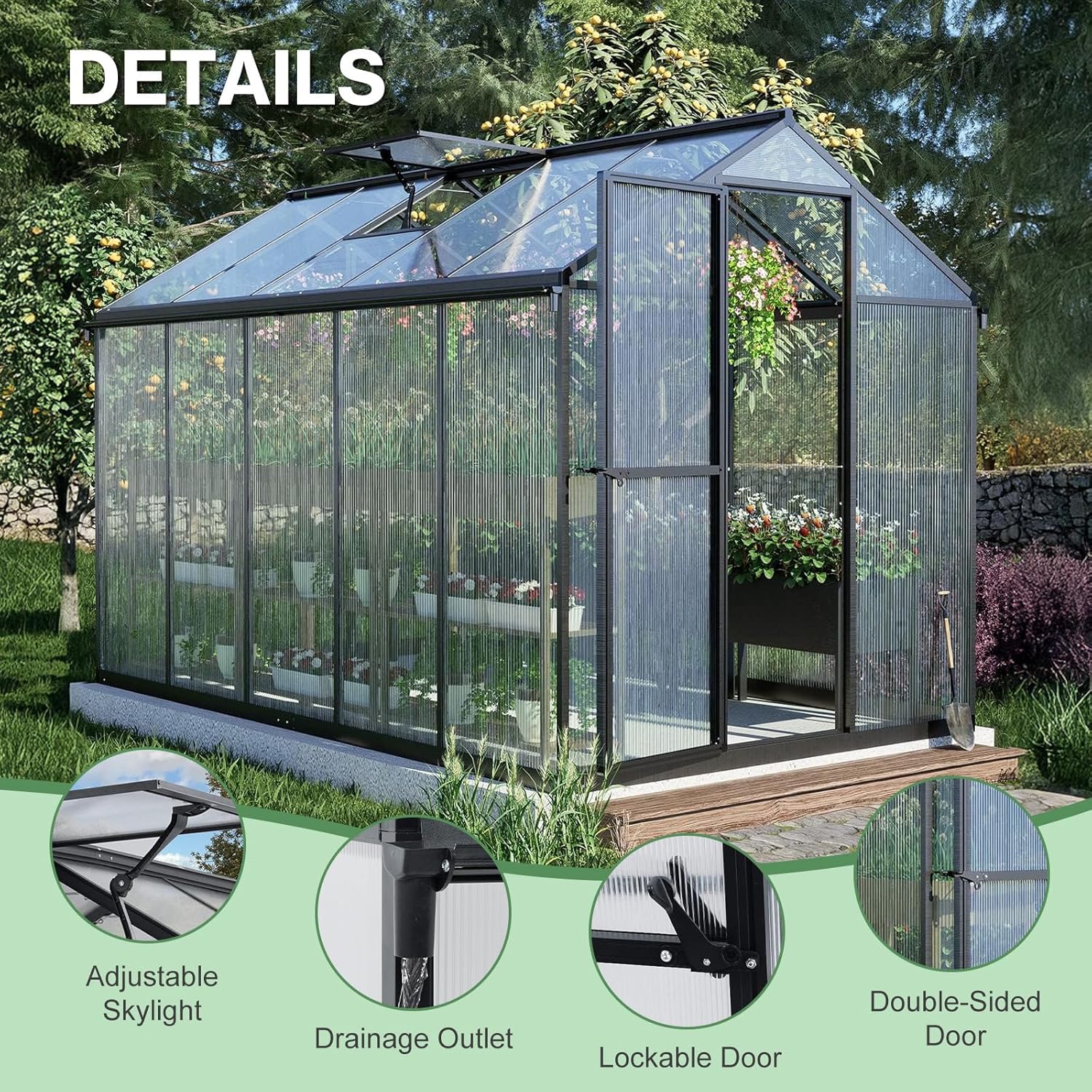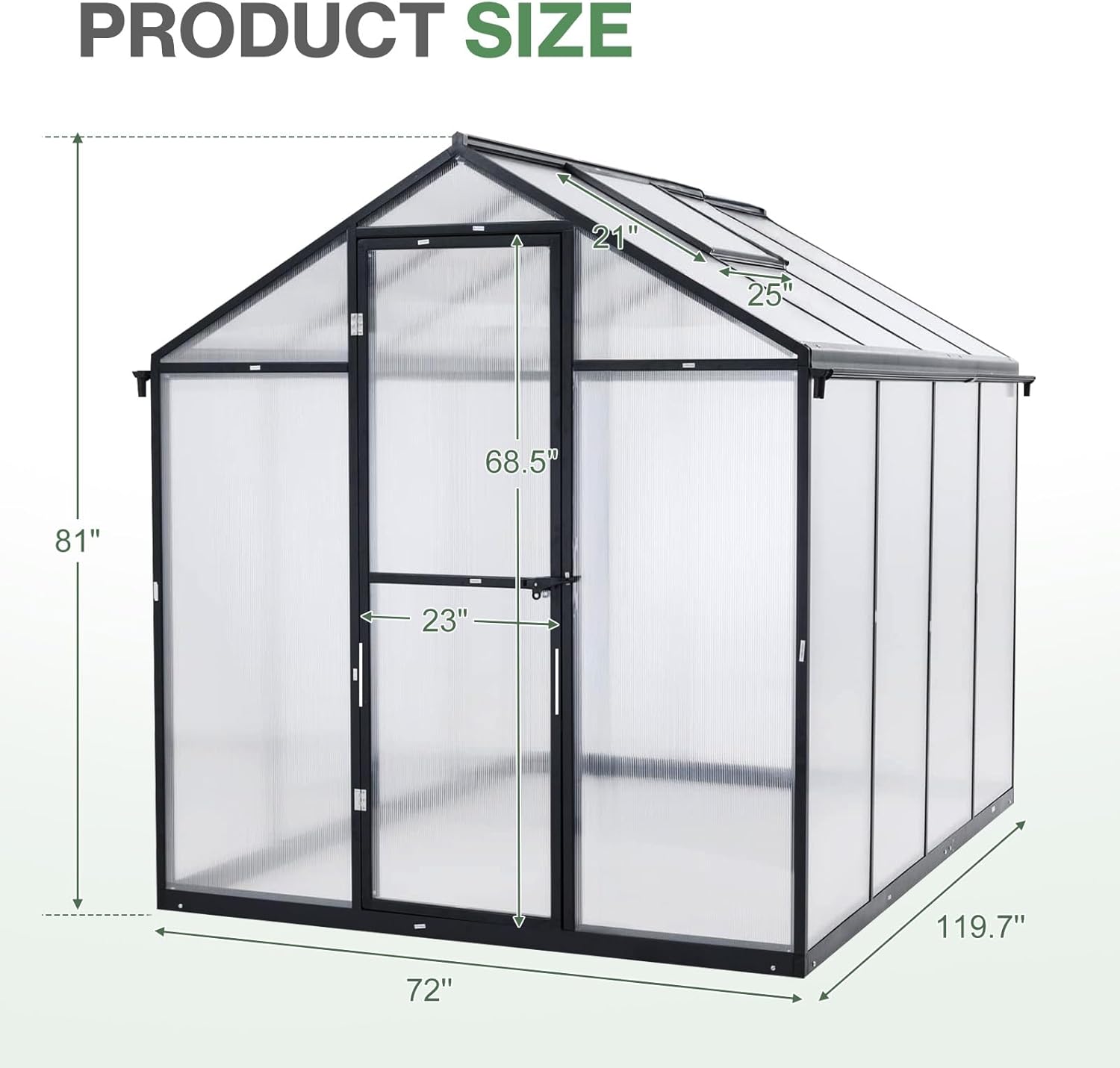 Aoodor 6 x 10 Ft Walk-in Greenhouse with Gutter, Polycarbonate and Heavy-Duty Aluminum Frame, Adjustment Skylight and Lockable 2-Sided Door for Patio, Outdoor, Yard, Lawn Use, Black