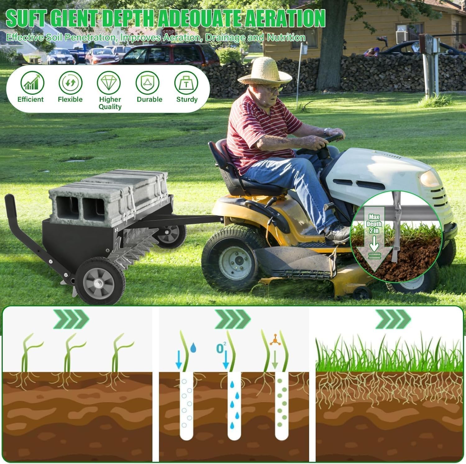 - 【WEIGHTED TRAY】Featuring a sturdy weighted tray,side panels and solid steel shafts with an all-steel design, that can hold up to 130lbs of additional weight,which ensures durability and reliability,you can add cement blocks or other weights at the tow spike aerator as needed to achieve maximum soil penetration.