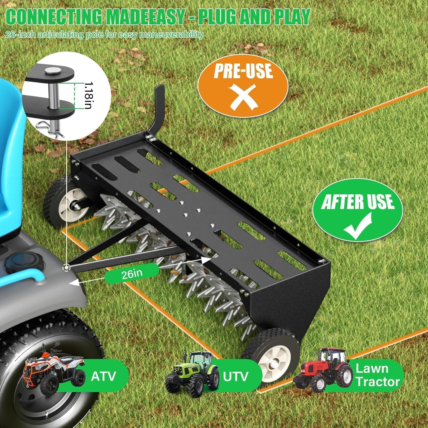 - 【EASY TO ASSEMBLE AND OPERATE】The 40-Inch Tow Behind Spike Aerator comes with an instruction manual, you can easily complete the assembly according to the instruction manual, saving your time and easy to operate, the lawn aerator tow is suitable for connection to any brand of tractor.