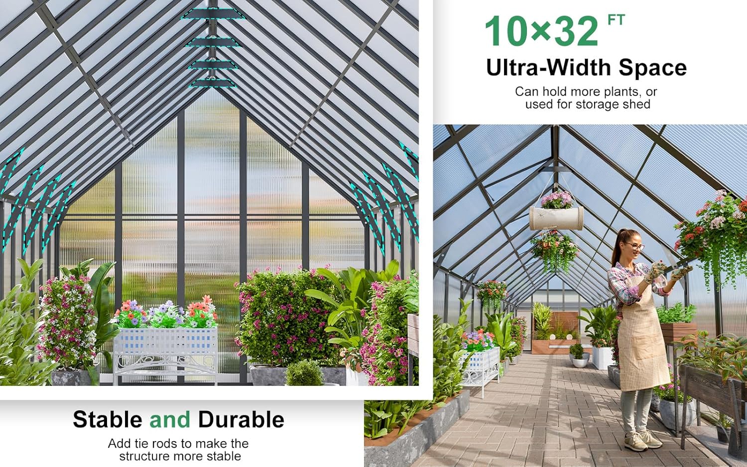 CDCASA 10x32 FT Greenhouse for Outdoors,Large Easy Assembly Thicker Aluminum Polycarbonate Greenhouses w/7 Windows, Double Door, Walk-in Green House for Outside,Patio,Backyard,Garden