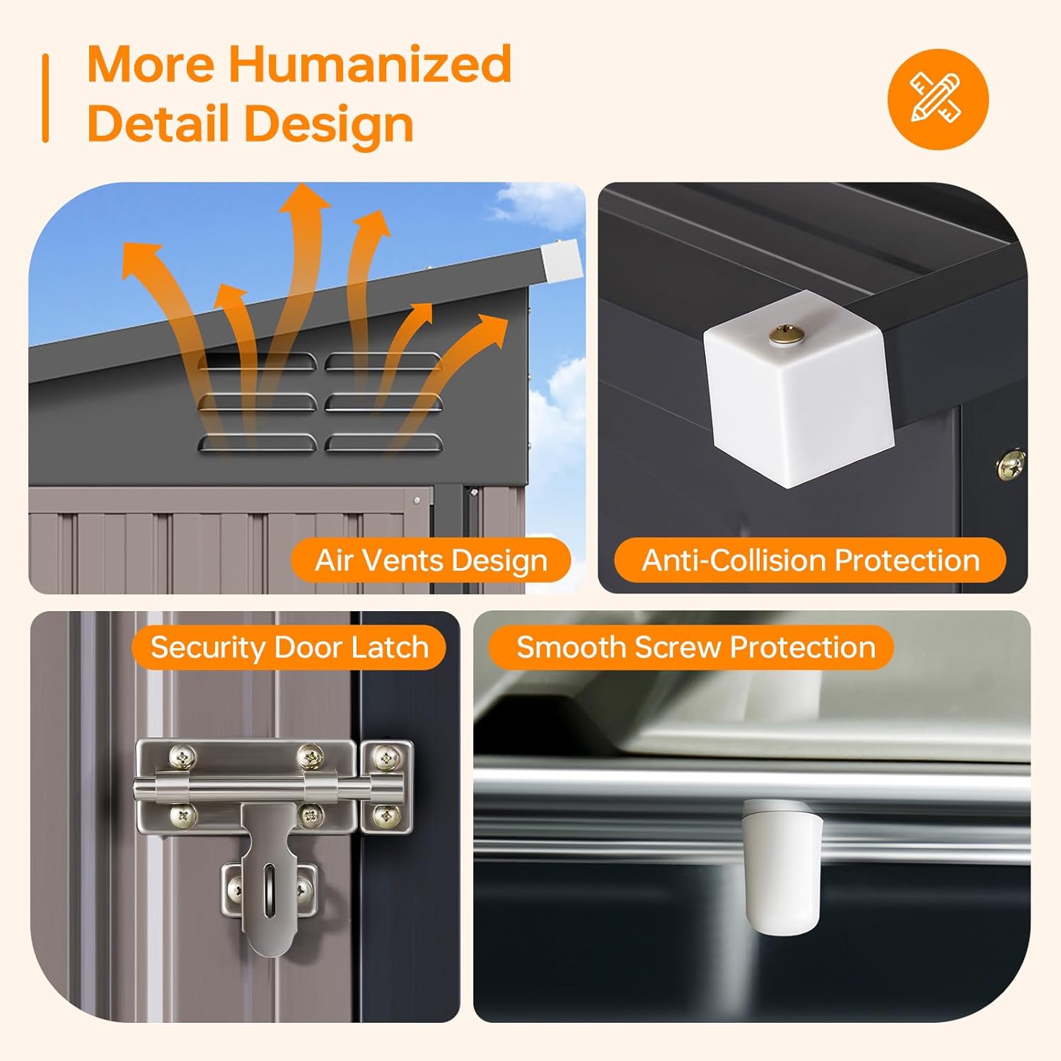 - Sloped Roof & Lockable Security: The sloping roof design efficiently sheds rainwater and optimizes interior space. Integrate air vents promote airflow, and padlock-compatible doors ensure convenient access alongside heightened protection for stored belongings.