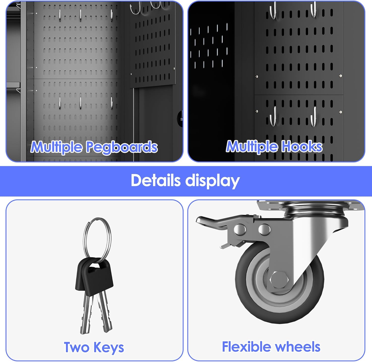 27.6 in Wide Garage Storage Cabinet with Wheels, Metal Storage Cabinet with Pegboards and 4 Adjustable Shelves, Garage Storage System with Lockable Door for Offices, Gyms and Pantries, Black