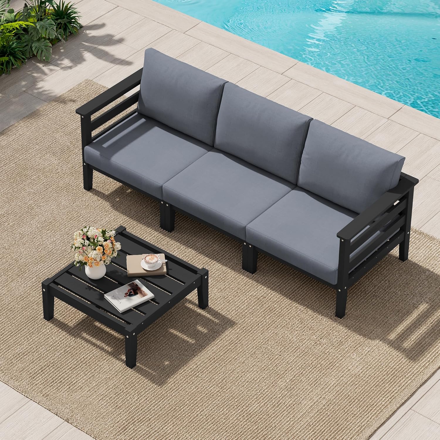 SERWALL HDPE Patio Furniture Set 4 Pieces, All-Weather Wood-Like Outdoor Sofa Couch with Coffee Table for Deck, Lawn, Black Frame with Grey Cushion