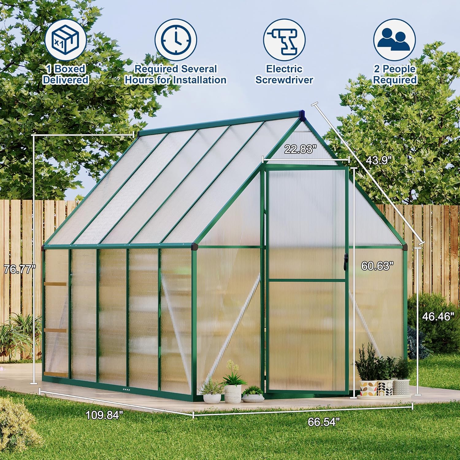 6'X9' Aluminum-Framed Polycarbonate Greenhouse, Heavy Duty Polycarbonate Greenhouse with Quick Setup Structure and Roof Vent, Large Enhanced Aluminum Greenhouses Kit for Outdoors