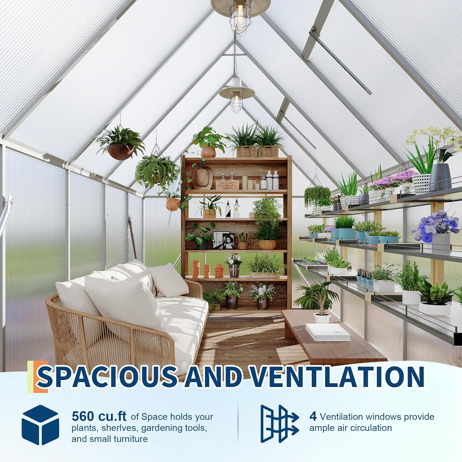 - Upgraded Aluminum Frame - Engineered with high quality aluminum parts, this winter polycarbonate greenhouse with automatic roof vents is built to withstand the elements. Its reinforced, weather resistant frame offers year round durability, ensuring a reliable outdoor gardening environment for all seasons. Wind Rating: 50 mph; Snow Load Capacity: 40 KGS/SQM