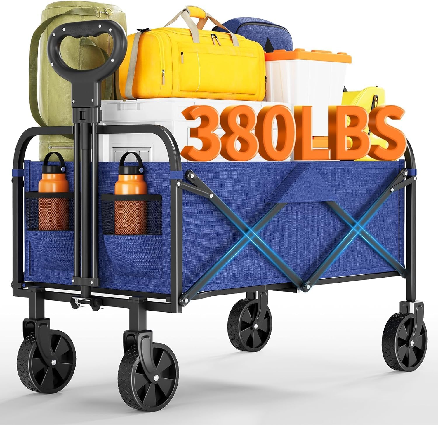 Foldable Wagon Cart, 380LBS Capacity Collapsible Wagon with All-Terrain Wheels, 220L Foldable Utility Cart & Grocery Cart on Wheels, Portable Lightweight 12LBS for Outdoor, Beach, Garden (Blue)
